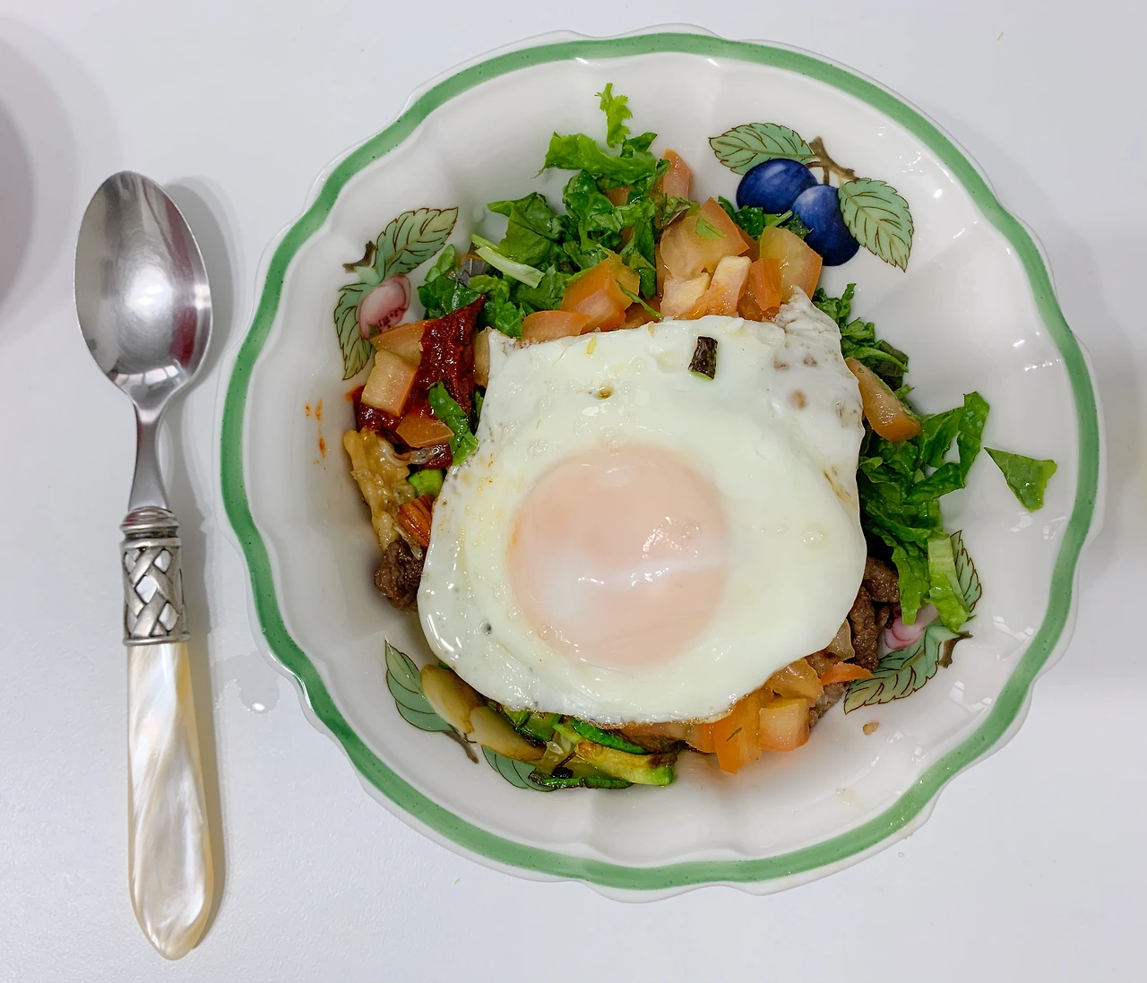 재료는 요리하고 남은 토마토, 상추, 엄마가 해준 세상에서 제일 맛있는 멸치볶음, 전날에 해놓은 귀리 밥, 꽤 예전에 사놓은 애호박, 고추장 그리고 컬리 동물복지 유정란이다.