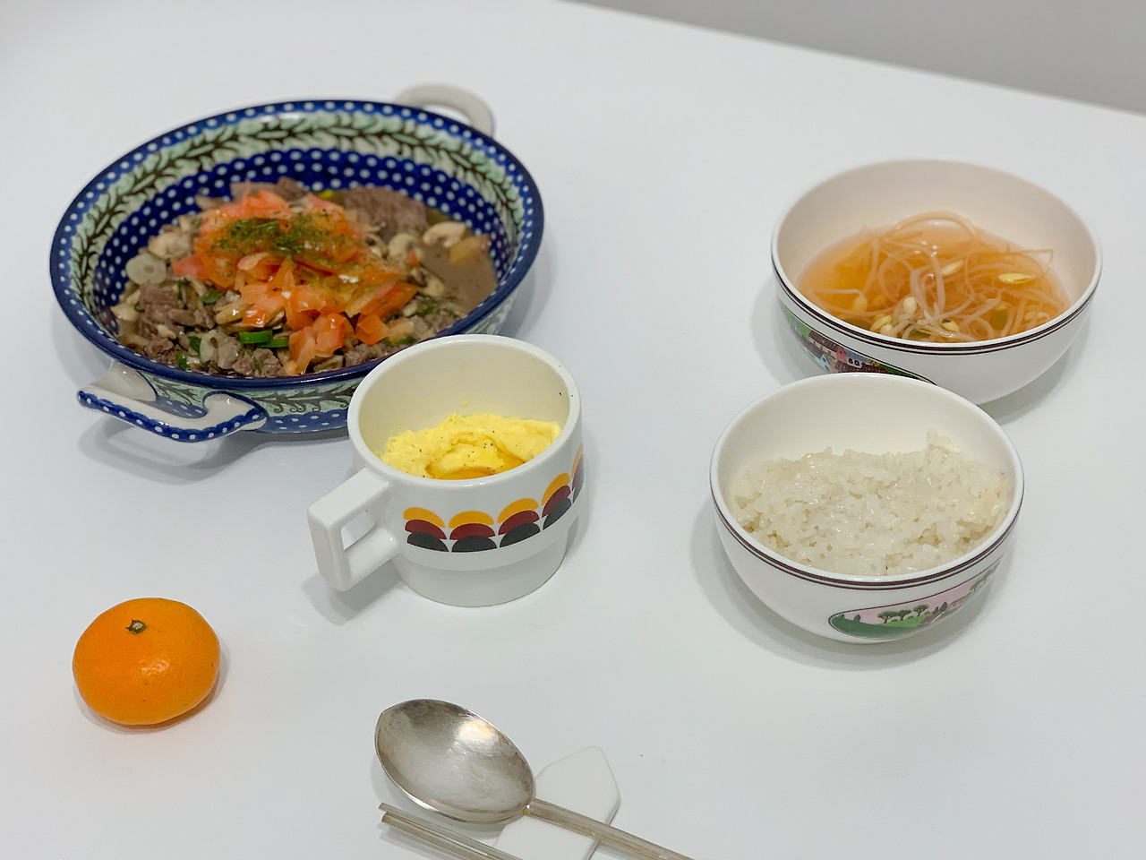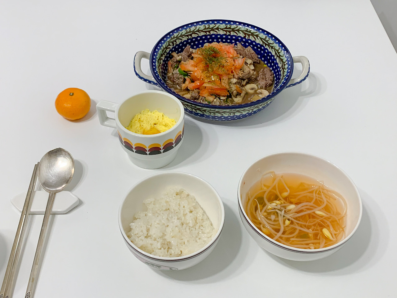 콩나물 국은 매콤~하고, 계란찜은 부드럽고 고소해 맛이 조화를 이룬다. 너무 맵기만 하면 나중에 화장실 갈 수도 있는데, 계란찜이 있어서 다행이었다. 식감은 토마토 안심 스튜가 잡아준다. 고기의 질감과 토마토의 단단함이 자칫하면 유동식 느낌이 날 수 있는 다른 음식의 식감을 보완한다.