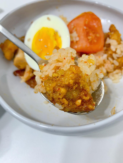 어느 정도 치킨이 바싹말랑해지면 가위로 치킨을 잘게 잘라준다. 그런 뒤에 밥을 넣는다. 밥과 치킨이 잘 섞이도록 골고루 비벼준 뒤에 올리브 오일과 참기름을 휘휘 둘러준다. 기름을 둘러준 뒤에는 한 번 더 밥과 치킨이 잘 섞이도록 비벼준다. 이때 참기름 냄새가 고소~하게 올라오는데, 진짜... 다 때려치고 당장 숟가락 들고 와구와구 먹고 싶었다. 기름을 어느 정도 둘러주니, 밥도 살짝 꼬들해지는 게 완전 내 취향.