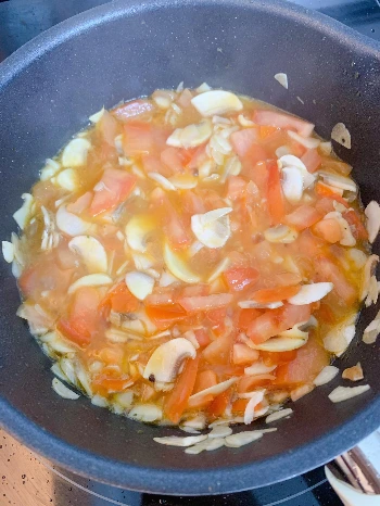 마늘과 토마토, 양송이버섯을 잘게 잘라준다. 미리 예열한 팬에 올리브 오일을 두르고 마늘을 먼저 볶아 향을 낸다. 약 4분 정도가 지나고 매운 향이 사라지면, 버섯을 넣는다. 버섯이 투명해지면 토마토를 넣고 볶아준다.