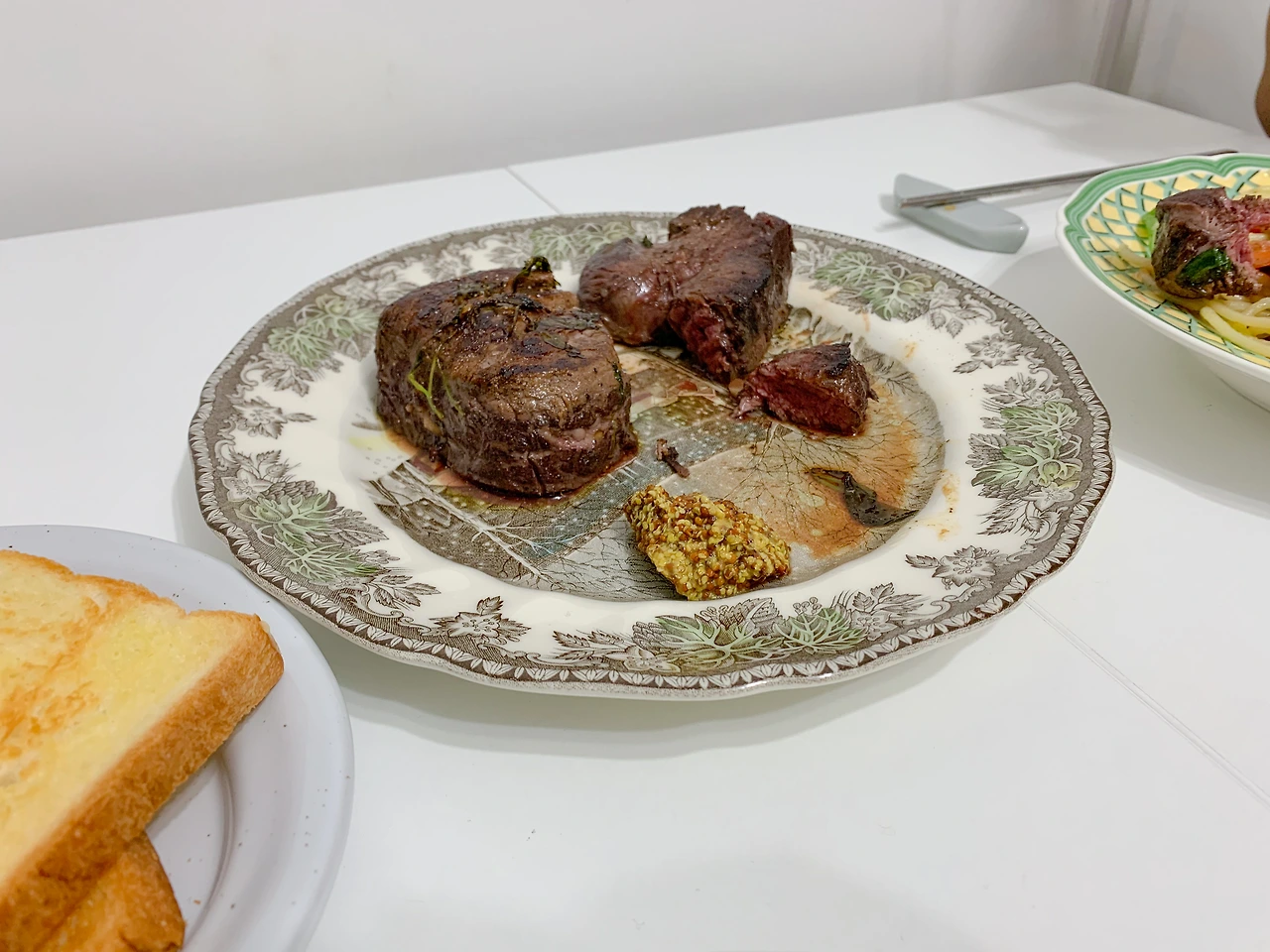 스테이크는 팬에 버터나 올리브 유를 두르고 센 불에서 시어링한다. 이번엔 선물받은 빵도 있어서 남은 마늘로 빵 표면을 살살 칠한 뒤 버터를 발라 구웠다. 마늘을 너무 세게 문지르면 아린 맛 밖에 안 나니, 마늘 향을 묻힌다는 느낌으로 바른다.