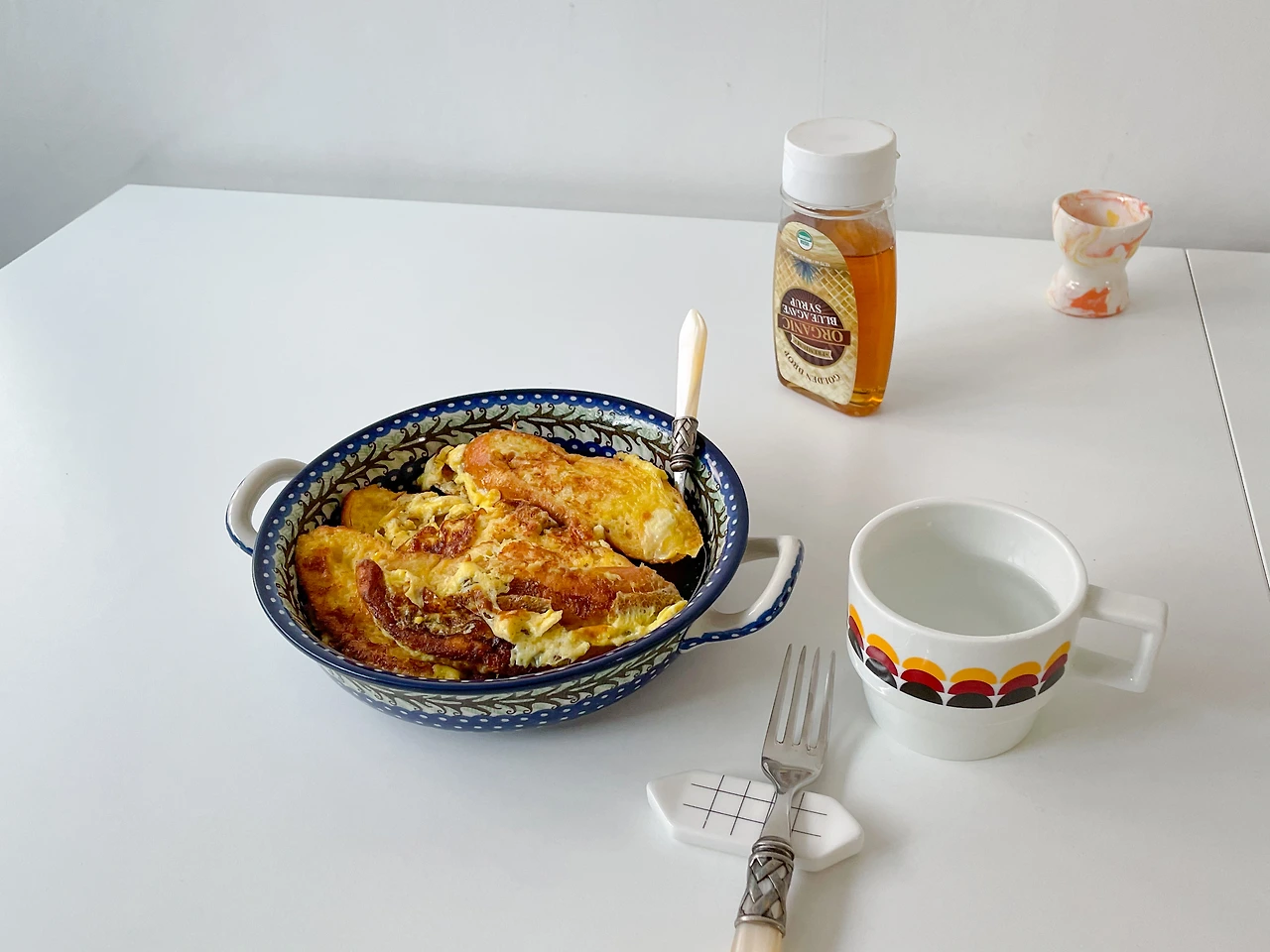 그리하여 완성된 프렌치토스트. 아가베 시럽을 듬뿍 뿌려서 먹는다. 달달하고 고소한 맛이 입안 가득하다. 요새 계속 쌀밥만 먹었더니, 다시 빵이 당기는 시기가 온 것 같다. 둘이서 배부르게 먹고 나는 CD님께서 주신 사과즙을, 남편은 미리 내려놓은 커피를 마신다.