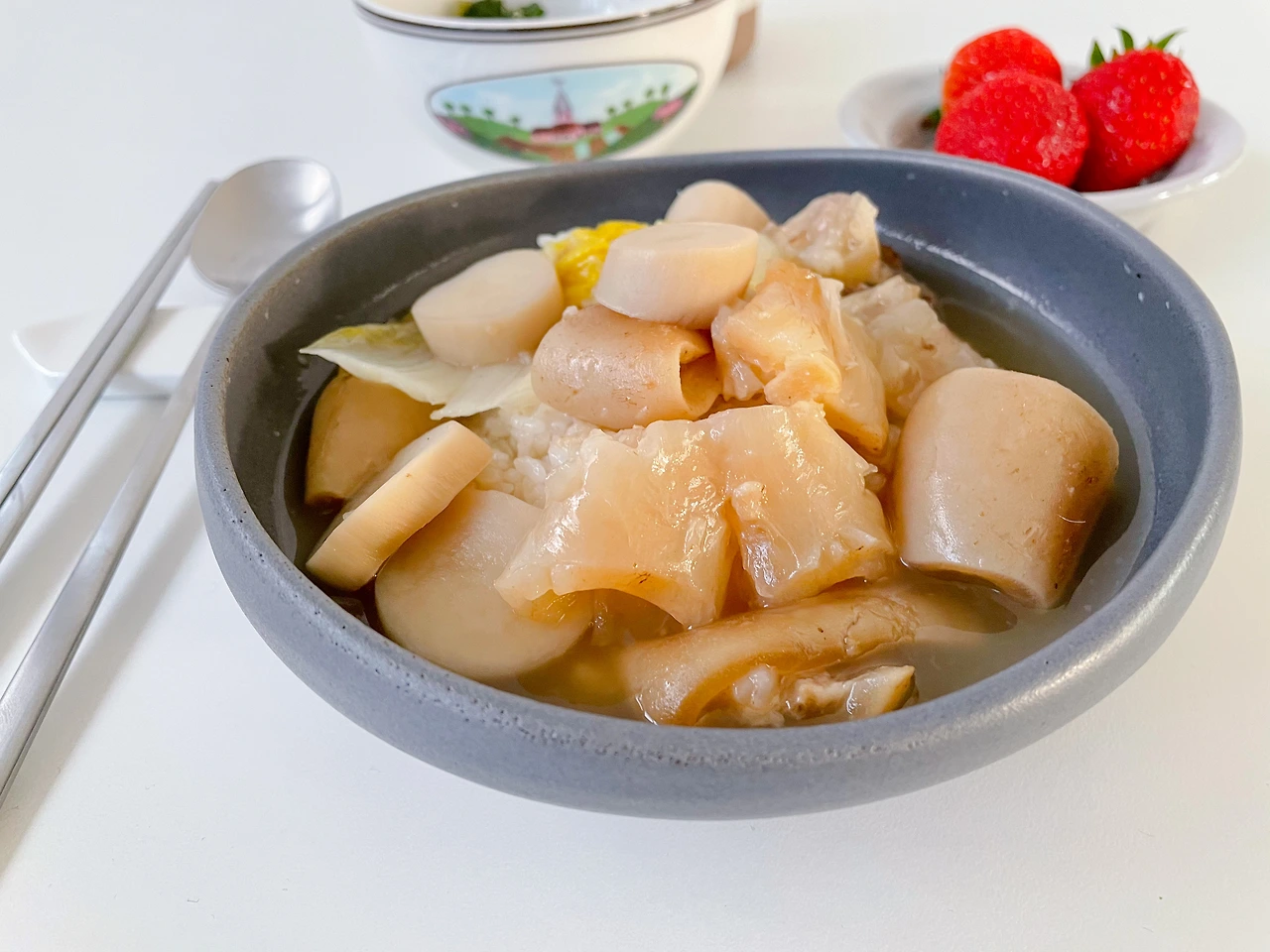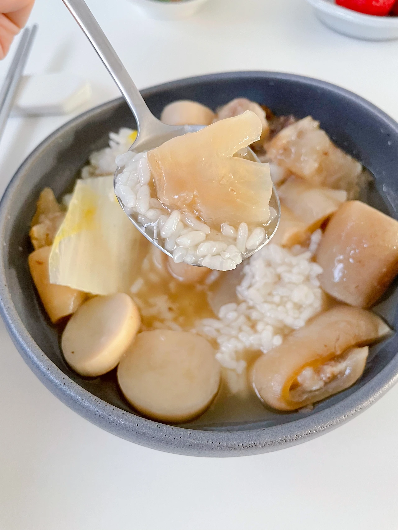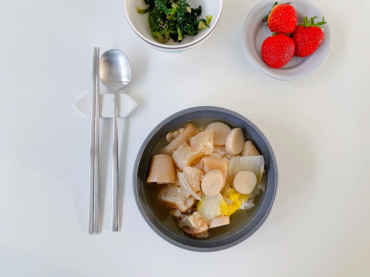 밥은 이미 쿠쿠가 해놓았기에, 우족 사골이 해동되자마자 밥, 새송이버섯 그리고 배추를 넣고 함께 끓였다. 쌀은 컬리에서 판매하는 조선향미 제품을 사용하는데, 물 넣고 끓이거나 국에 넣고 끓이면 고소한 풍미가 배가된다.