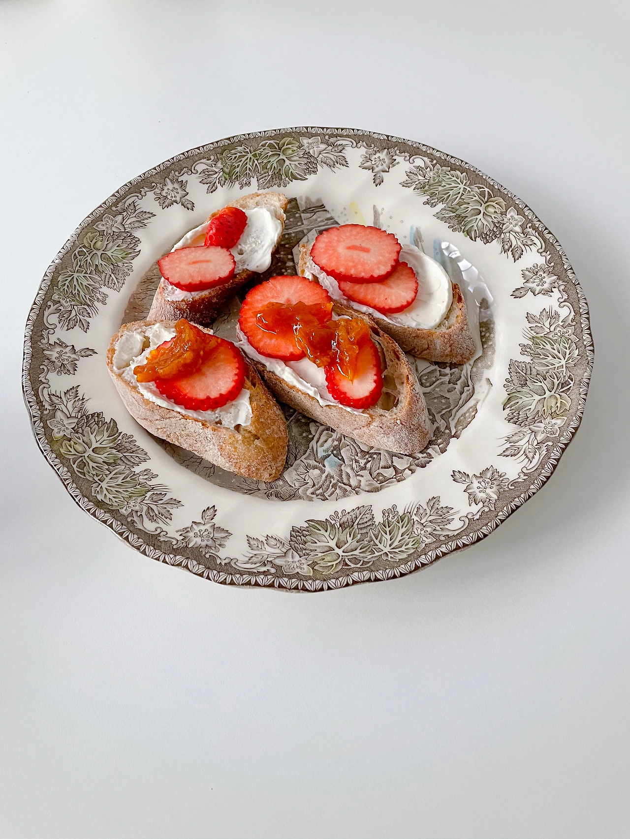 바게트 빵에 크림치즈를 바르고, 썰어놓은 딸기를 올린 뒤, 잼을 올리면 끝!