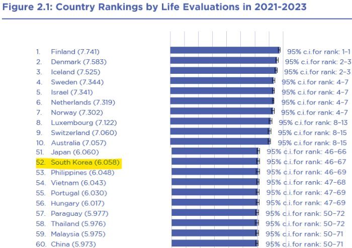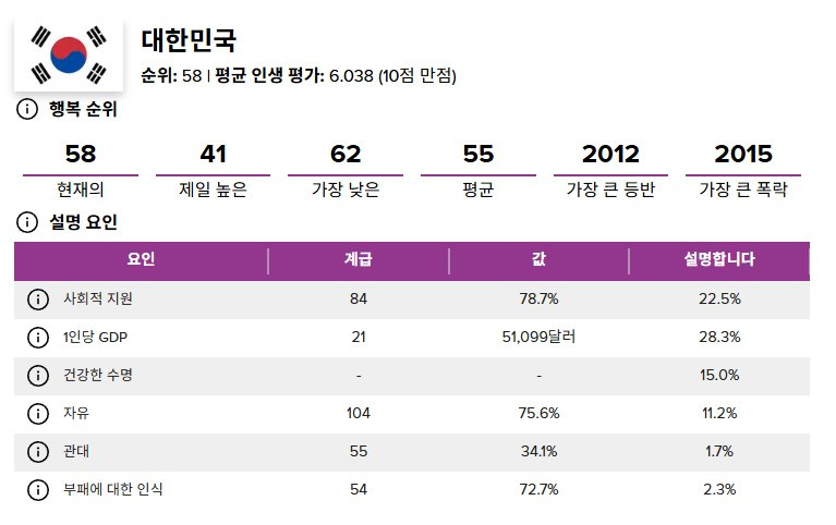 반면 한국은 '사회적 지원' 항목에서 58위, 특히 '삶의 자유' 부문에서는 충격적 이게도 104위에 그쳤습니다. 여기서 '자유'는 우리가 통상적으로 생각하는 그런 자유라기보다는 중요한 인생 선택을 뜻한다고 합니다. 즉, 내가 먹고사는 그 일이 '내가 원해서'가 아닌 '어쩔 수 없이' 결정한다고 느끼는 경우가 많다는 것이라고 합니다. 이 부분에서 놀랍게도 '베트남'이 2위라고 합니다.