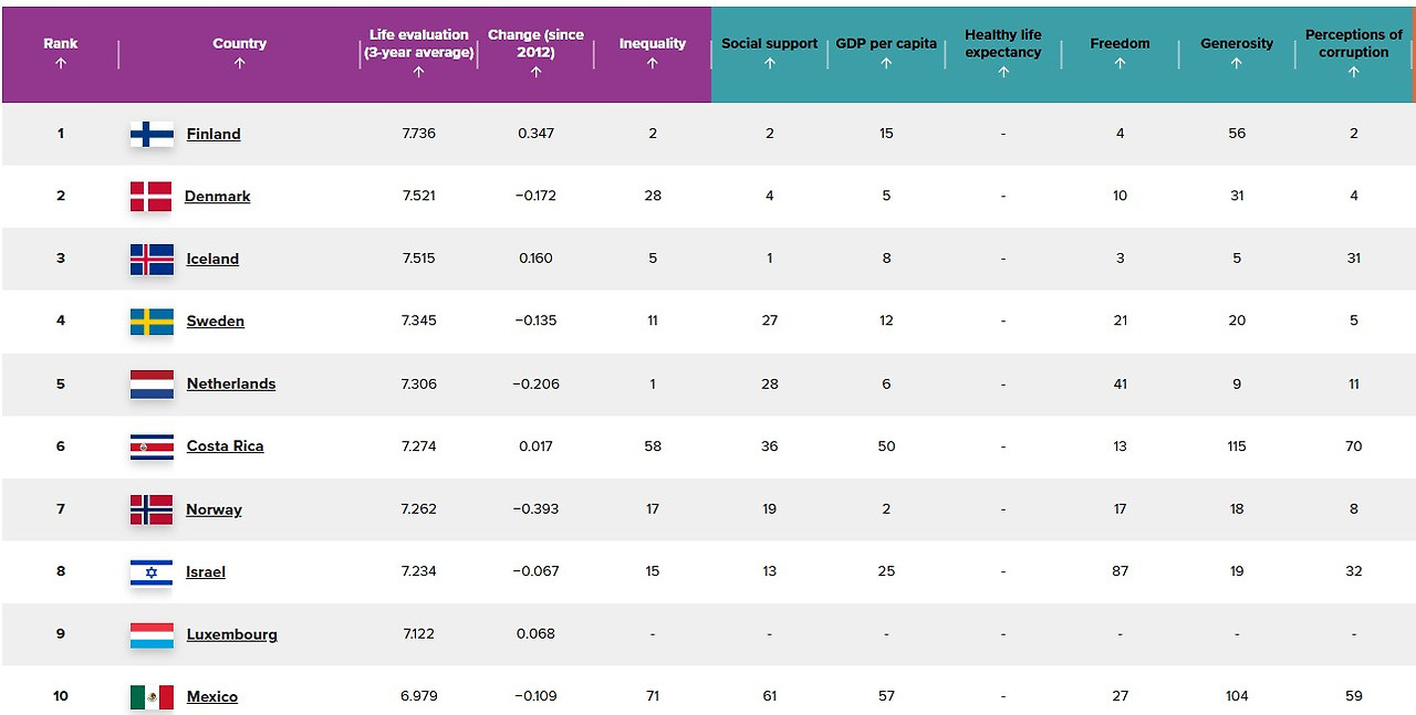 위 사진과 같이 북유럽 국가들이 지속적으로 행복 순위 상위권을 차지하고 있습니다. 이유는 '사회적 지원', '관대함', '낮은 부패', 그리고 '삶의 선택 자유'가 깊이 뿌리내리고 있기 때문이라고 합니다. 여기서 흥미로운 건 전쟁의 화마에 휩싸여 있는 '이스라엘'이 9위, 마약 카르텔이 국가의 근간을 흔드는 '멕시코'가 10위입니다. 이쯤 되면 이런 생각이 들게 됩니다. "이거 뭐야~ 엉터리네", 그런데 이유가 있었습니다.