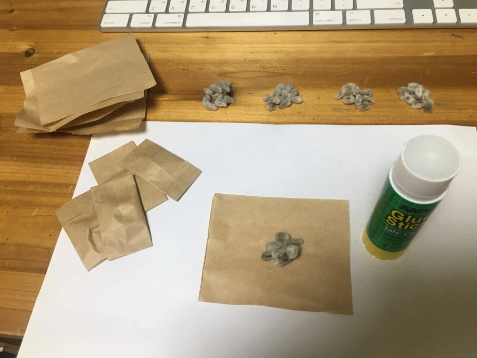 포장되어왔던 종이봉투를 다시 잘라 재이용하여 씨앗 봉투를 만들고 10알씩 소포장하여 보물을 곱게 싼다.