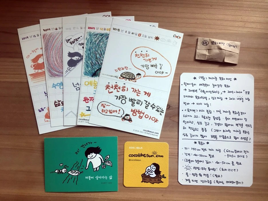 그래서 나도 또 고마워서 내 작업 물들(그림일기 엽서, 법구경 카드 등)을 함께 선물했다.