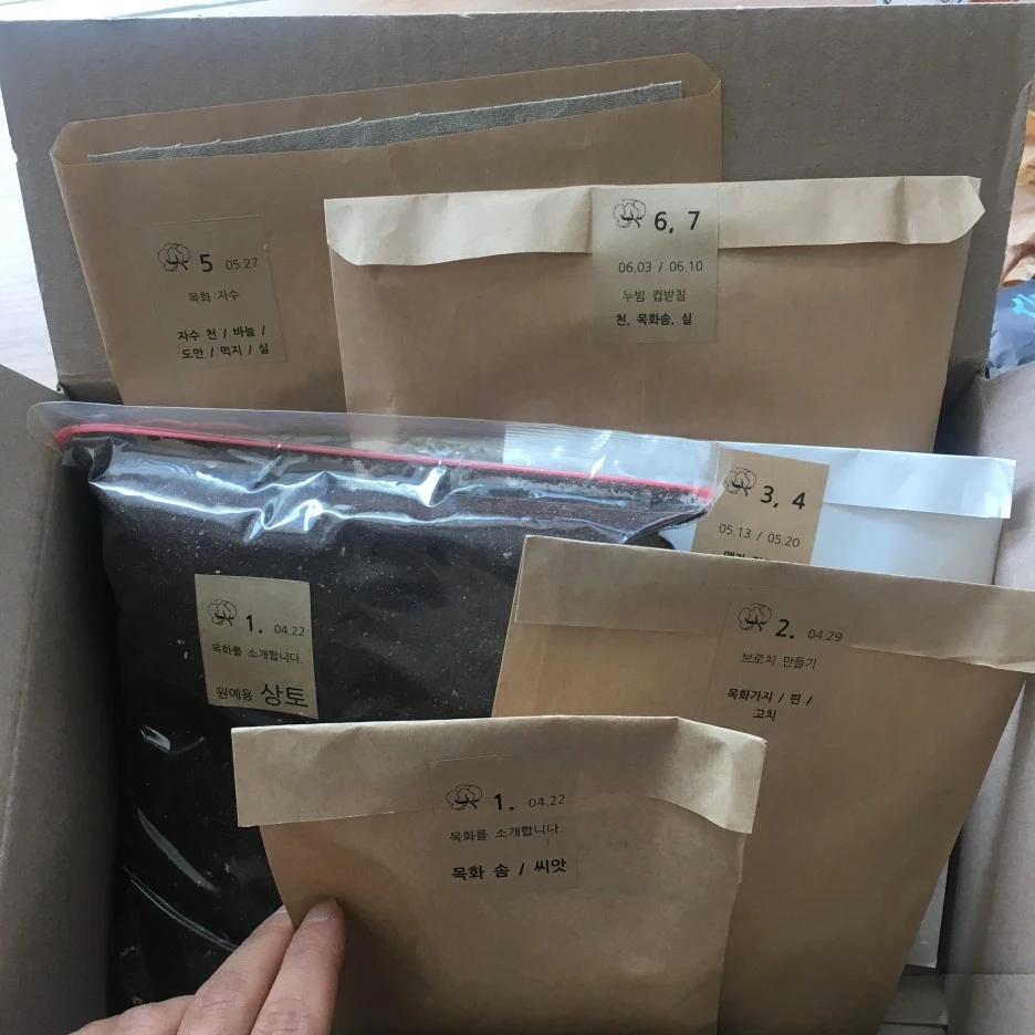 <목화학교> 소식을 듣고 바로 등록을 하였기에, 목화를 직접 재배할 수 있도록 씨앗 나눔을 해주셨는데 그 패키지가 오늘 도착한 것이다. 주위에 나눔 할 수 있도록 좀 더 씨앗을 보내달라고 요청드렸더니 감사하게도 흔쾌히 따로 더 챙겨주셨다.