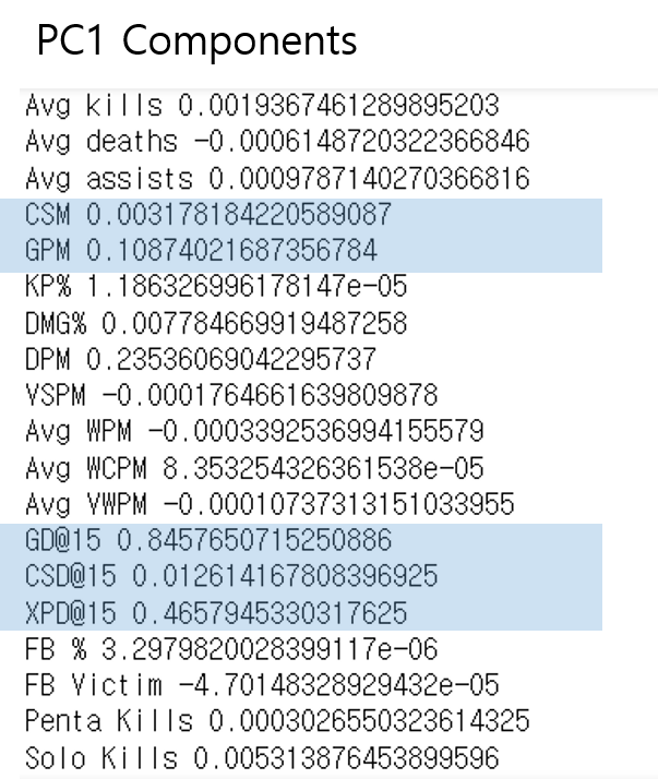 설명 변수들 중 PC1에 영향을 많이 주는 것들을 보면, 15분 지표들입니다. 15분 전에 경험치/골드에서 얼마나 앞섰는가, CS를 얼마나 리드하고 있는가가 나타납니다. 여기에 더해서 분당 CS와 골드도 PC1에 기여하고 있는데요.
