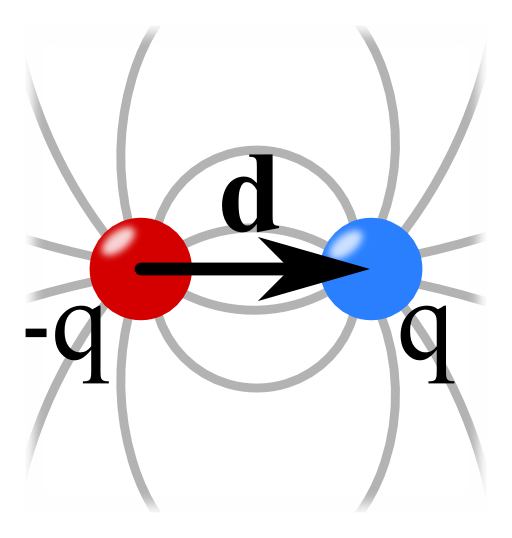 이 때문에 전기장은 바로 전하의 이동, 전기적인 에너지와 관련이 있습니다. 특히, (+)와 (-)가 하나씩 있어서 전기장을 만드는 경우를 전기 쌍극자(Electric dipole)라고 부릅니다. 실제로는 이 쌍극자의 개념이 많이 중요한데요, 그 이유는 원자나 고체 물질들은 (+)와 (-)의 조합으로 이루어져 있기 때문입니다.