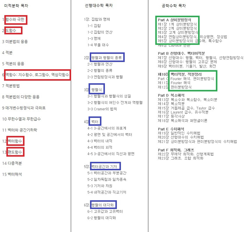 그렇다면 우리가 다룰 내용은 미적분학, 선형대수학, 공업 수학(고급 미적분학)입니다.