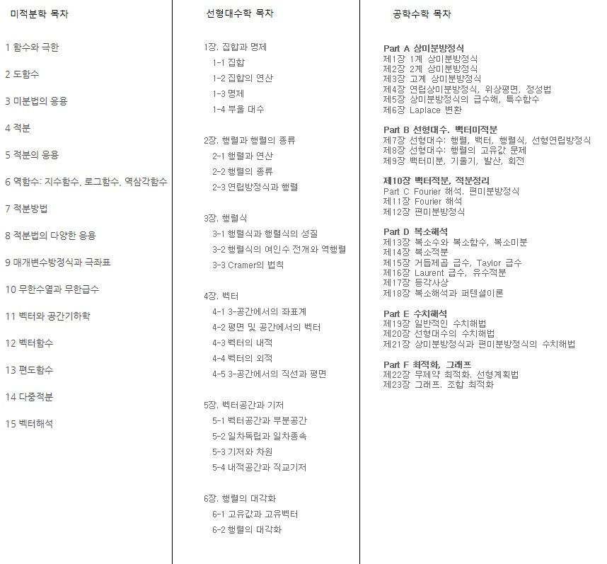 그래서, 공대에서 공통으로 배우는 수학적 내용들을, 교과서 목차와 함께 살펴보려고 합니다. 구체적인 계산 없이 어떤 내용을 배우는지 훑어볼겁니다.ㅎㅎ!