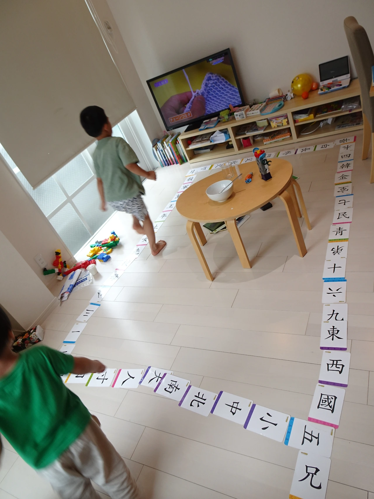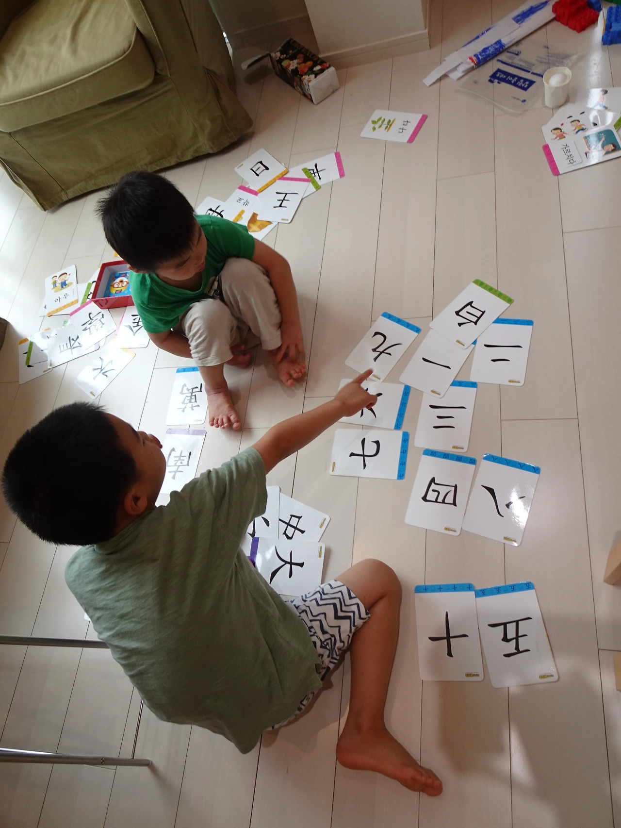 1. 한자카드 흩어놓고 색깔별로 모으기, 한자로 숫자 순서대로 놓기, 한자 징검다리 만들기, 마지막 은 단어카드 모아 던지기(;;)