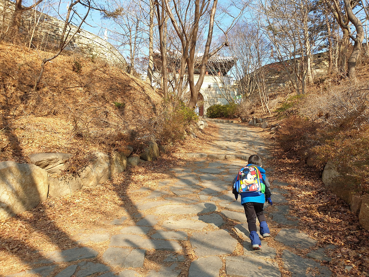3.8km를 걸어 북문까지 도착하여 광장에 남아있는 눈(snow)을 가지고 한참을 놀다가 해지기 전에 하산했다. (내려오는 길은 1.6km 거리, 나머지는 버스를 이용한다)