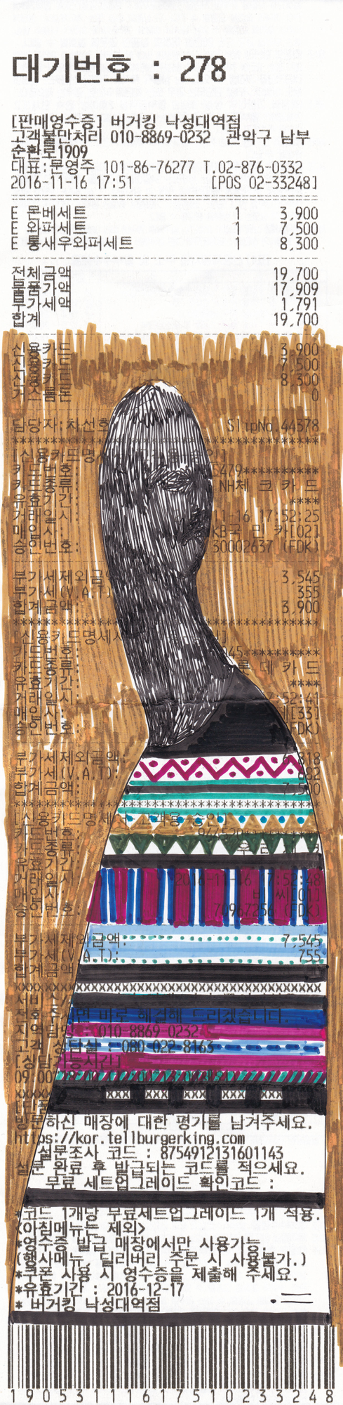 이러한 아프리카 전통부족의 문양의 옷을 입은 사람들을 두, 세 장 정도 그린 것으로 기억한다. 뚜렷한 목적은 없었고 그저 그 문양이 주는 시각적인 자극이 좋아서 떠오르는 대로 점과 선을 그렸다. 어쩌다 보니 그것이 관습처럼 남아 종종 그림에서 점과 선의 반복이 등장하곤 한다. 일전에 한 번 그림에 자주 등장하는 줄무늬가 가진 의미가 무엇인지 묻는 분이 계셨다. 나는 대답을 머뭇거리다가 그저 의미 없는 낙서의 한 종류라고 답했다. 길어진 통화의 끝에는 종종 정체를 알 수 없는 낙서들이 달력이나 다이어리에 남는다. 그저 의미 없는 반복적이고 조잡한 점과 선의 집합은 누군가의 고민 상담이 되고 누군가의 그리움이며 누군가의 애틋함이 되기도 한다. 그럼에도 나의 그림에 등장하는 줄무늬는 여전히 무의미의 형상으로 두고 싶다. 때로는 의미가 없는 곳에 더 많은 이야기가 담기곤 했다.