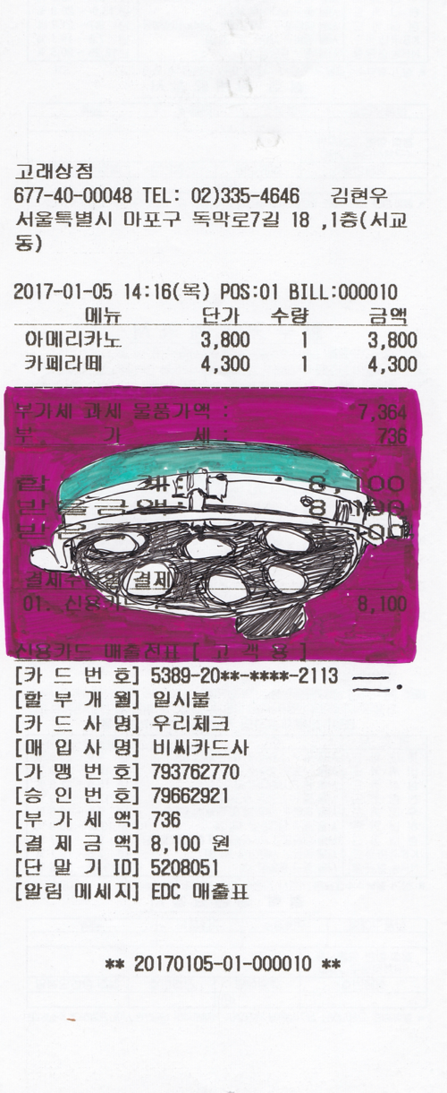 합정역 근처에는 독특한 카페가 하나 있었다. 그날은 새로운 카페를 찾아 이곳저곳 걸어 다니던 날이었다. 합정의 골목은 너도 나도 얼굴을 들이미는 가게들로 붐비는 곳이다. 보행에 방해가 될 만큼 가게들은 저마다의 물건을 탁상에 꺼내 두었고 인도는 무의미한 길이었다. 그렇게 한참을 인도와 차도를 오르락내리락하며 걷던 중에 비어있는 공간이 나타났다. 건물 사이에 공터가 있었고 움푹 들어간 곳에 나지막한 건물이 하나 있었다. 그리고 다소 거친 글씨로 쓰여있는 '고래 상점'을 마주쳤다. 나는 그 기묘한 공백을 선전하는 카페로 발걸음을 향했다. 내부에는 노란 할로겐 조명들이 많았고 천장에는 커다란 수술대 조명이 샹들리에마냥 걸려있었다. 마치 sf 영화나 디스토피아물에서 볼 법한 낡은 수술대 조명은 한창 빈티지에 빠져있던 나를 붙잡아두기에 충분했다. 그날은 영수증을 받자마자 저 조명을 그렸다. 오묘한 에메랄드색 페인트와 사이에 핀 녹들을 눈으로 훑으며 그동안 보았던 영화와 드라마들을 기억으로 훑었다. 인류를 위협하는 바이러스와의 사투, 감염자를 살리기 위한 인턴 의사의 간절한 수술을 떠올리며.