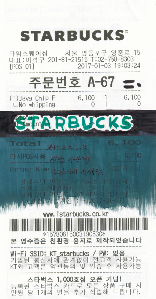 영국여행을 갔던 2016년에는 런던에 살고 있는 이모와 함께 여기저기를 다녔다. 이모와 빈티지 마켓을 찾은 날이었던가, 나는 처음으로 스타벅스에서 다른 메뉴를 시켜보았다. 내가 마셔왔던 건 아메리카노와 라떼, 그리고 겨울에만 찾는 핫초코가 전부였다. "어우 자연아, 촌티 내지 말고 이모가 시키는 거나 먹어봐." 이모는 아주 기다란 이름의 메뉴를, 자바칩프라푸치노를 두 잔 주문했다. 내가 너무 맛있다며 한국에 돌아가면 꼭 이걸 다시 사 먹겠다고 말하자 그녀는 꽤나 흡족한 미소를 지으며 의기양양하게 카페의 문을 열고 나섰다. 이모는 내게 친구 같은 가족이었다. 아주 어릴 때부터 가깝게 지냈고 부모님은 모르는 비밀들도 시원하게 털어놓을 수 있는 유일한 어른이 이모였다. 무거운 공기를 참지 못하는 이모는 농담으로 분위기를 가볍게 띄우곤 했고 그녀의 촌철살인은 가족들에게 늘 웃음을 가져다주었다. 지금도 스타벅스에 가면 이모가 시키던 메뉴를 종종 찾는다. 자바칩은 이모의 농담처럼 달콤하고도 씁쓸하게 씹힌다.