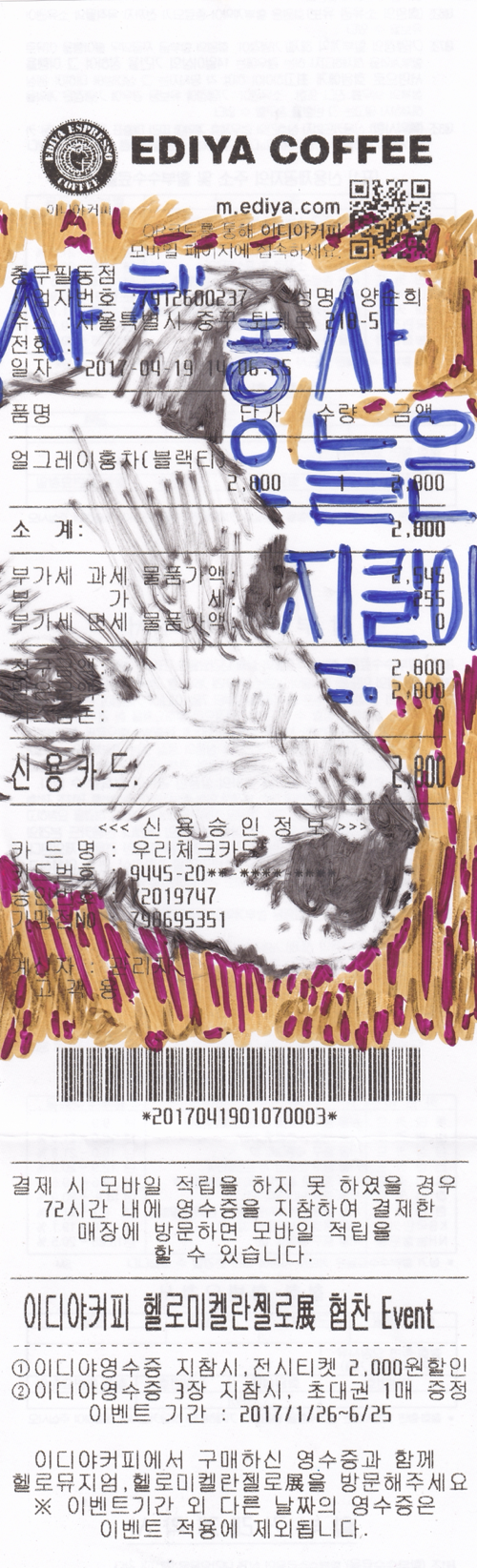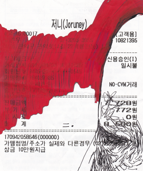 “음, 솔직히 그냥 저 드로잉북이 그릴 때 기분이 좋아서요. 종이도 두껍고 그 위에서 무슨 그림을 그려도 웬만해서는 종이가 버티더라고요. 그런 단단함이 좋았습니다. 그런데 영수증은 반대로 한없이 얇고 잘 찢어져요. 아주 가볍게 낙서한 그림이 오히려 사람들이 더 좋아해 주시는 걸 보고 드로잉북을 고집했던 것이 조금 민망해지더라고요 스스로. “