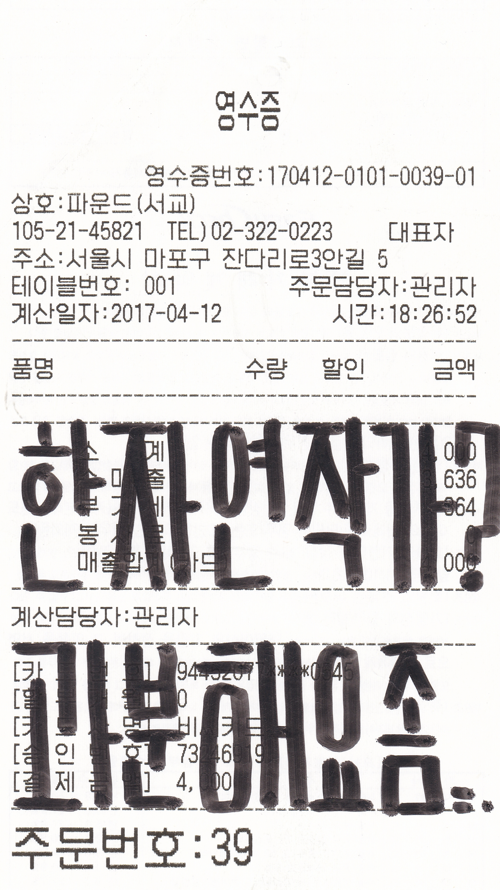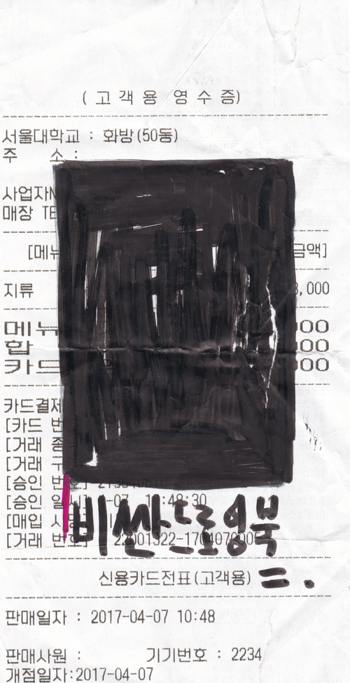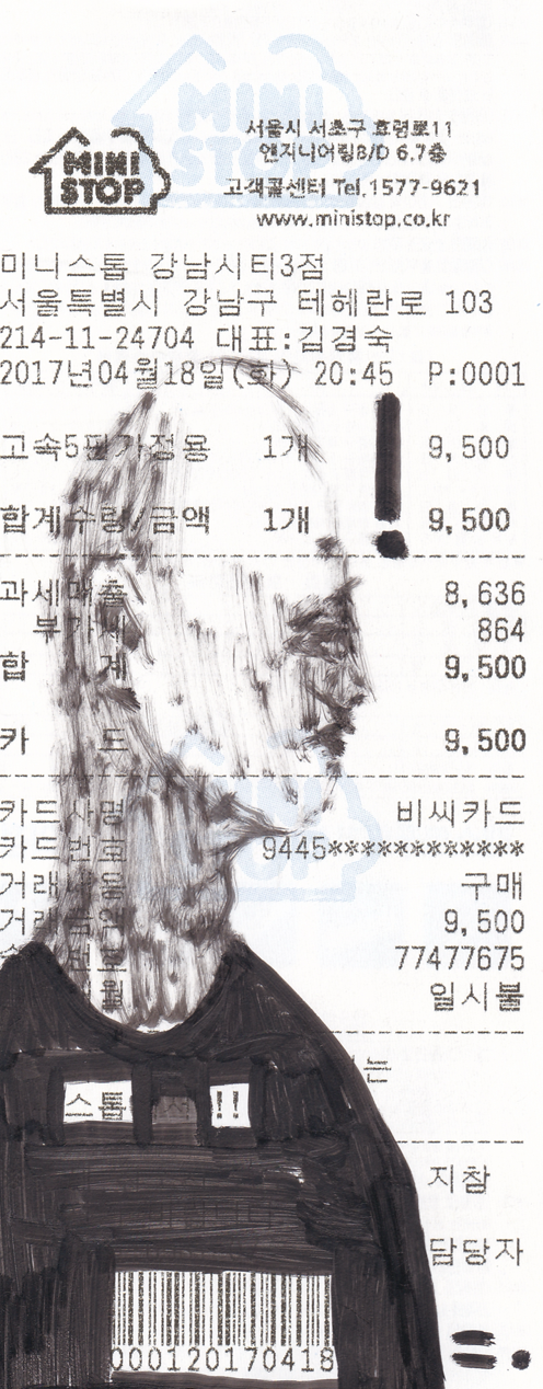 영수증에 그림을 그리게 된 계기는 이 드로잉북을 살 돈이 없어서였다. 브런치북 초장에 언급한 것처럼, 드로잉북을 사지 못한 날에 영수증에 한 낙서가 지금의 영수증 드로잉이 됐다. 한 번은 작가와의 대화에서 이와 같은 질문을 받은 적이 있다.
