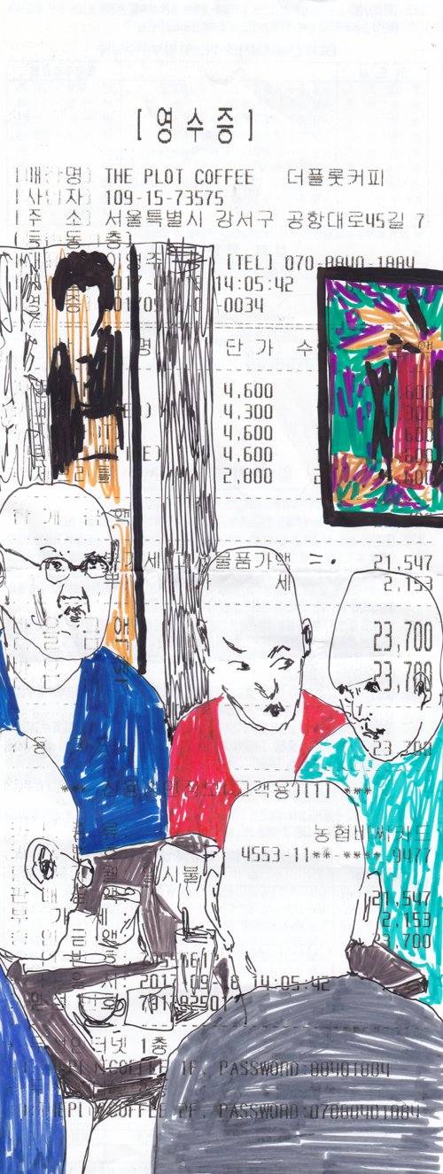 자화상을 보는 자화상이다. 그림에는 다양한 이야기가 담기지만 영수증은 특히나 나를 적나라하게 드러내고 있는 그대로를 담아내게 된다. 체크 플라넬 셔츠에 빠졌던 시기, 어떤 그림을 그려야 할지 몰라 방황하며 이런저런 시도를 하던 시기, 그리고 그것에 확신은 있으나 확인을 갈구했던 시기. 그림 속 자화상은 카페 cctv에 찍힌 공부하는 나의 모습을 담은 그림이다. 어느 날 카페에 앉아 공부를 하던 중에 문득 자화상을 어떻게 그려야 할지에 대한 생각에 펜을 멈추고 테라스로 향했다. 담배를 피우던 내 눈에 들어온 것은 cctv였다. 나의 모습을 인지하는 순간 나는 나를 똑바로 볼 수 없다. 거울 속 나는 있는 그대로일 수 없다. 그것은 허상에 가까운, 내가 원하는 나의 모습으로 형태를 조금씩 바꿔가며 비추기에 나는 거울을 자주 보지 않는다. 그런데 이 cctv는 내가 원하지 않는 순간까지도, 내가 나를 인지하지 못하는 순간에 나를 담는다. 그 길로 나는 학교로 향했고 사장님께 받은 cctv 영상의 스크린샷을 캔버스에 옮기기 시작했다. 그와 동시에 나는 다시 사진 속 나를 나로 인지함으로써 온전한 나를 그려내는 것이 맞는지에 대한 의구심이 들었다. 그리고 다시 펼쳐본 영수증 드로잉을 담은 지갑에는 내가 있었다. 온전하고도 차가운 글자들은 직설적으로 나의 행적을 담았고 그 위에 올라간 선들은 글자를 끌어안기도, 때로는 뿌리치기도 하며 발버둥 치는 나의 속내를 드러냈다.