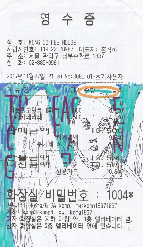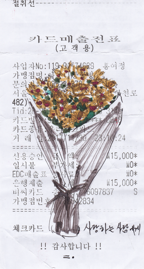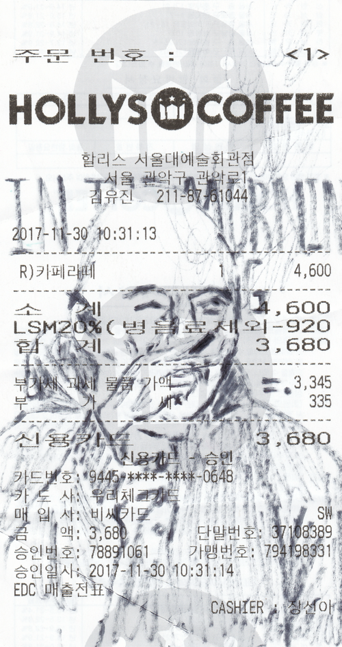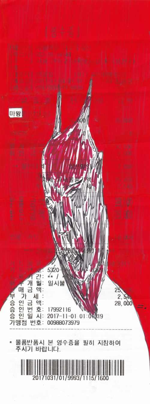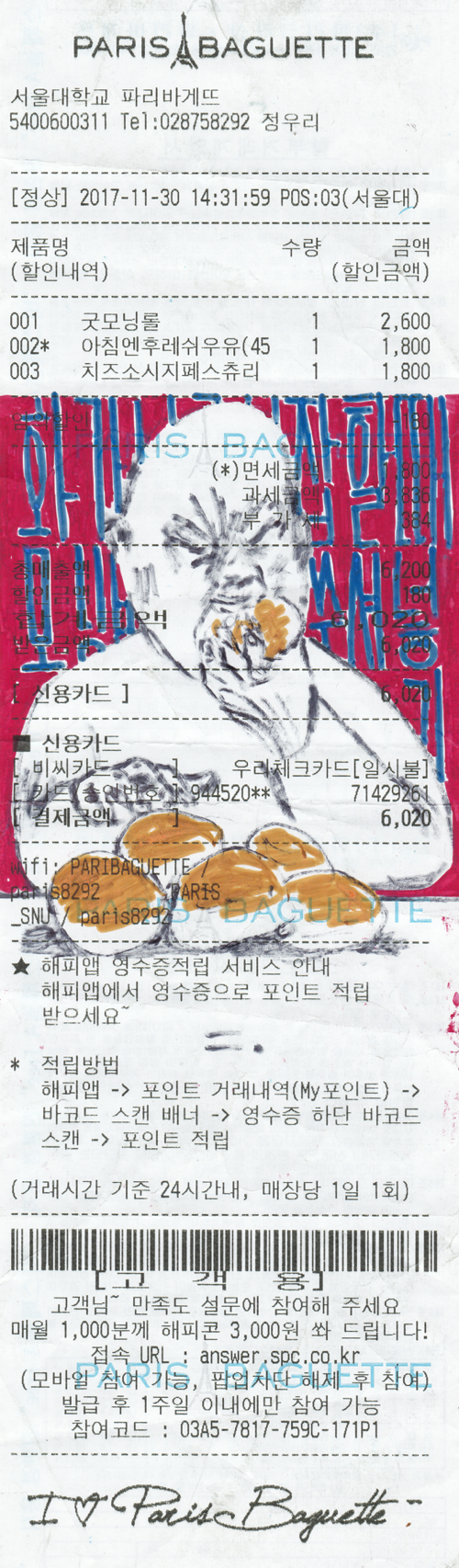 뭐가 그리 착잡했길래 빵 한 봉지를 한 번에 비웠을까. 사실 몇몇 영수증들에 대한 기억은 거의 남아있지 않다. 시간이 지나면서 흐려지는 것은 영수증의 글자만이 아니다. 당시에는 날카로웠던 감각들이 어느새 무뎌지고 더 이상 나의 하루를 방해하지 않게 됐다. 오래된 일기장을 볼 때마다 나는 과거의 나에게 수많은 물음표를 던지게 된다. 어떤 이유로 그러한 감정들을 느껴야만 했는지에 대해서 고민하고 또 회귀하지만 이미 그것은 감열지의 인쇄된 검은 잉크처럼 날아가버리고 말았다. 여전히 나는 작은 것들을 예민하게 감각하지만 그 반응의 크기가 확연히 줄었다. 이제 막 자라기 시작한 풀은 작은 상처에도 쉽게 시들고 꺾이기 마련이다. 어쩌면 나는 이제야 껍질이라 부를만한 것을 갖춘 나무의 시작점에 서게 된 건 아닐까 하는 생각과 함께 그것이 왜 이제야 온 것인지에 대한 갈 곳 없는 원망을 품어보기도 한다. 하지만 그럼에도 선명하게 남은 것이 그림이다. 그림은 그 의미와는 상관없이 자신만의 형상으로 남아 기억의 실마리와 함께, 그때의 손끝에 닿은 감각을 온전히 보존하고 전달한다. 오래된 그림은 어린 시절 발가벗은 모습이 담긴 사진과도 같다. 그것은 분명 더 이상 존재하지 않는 나이기에 온전히 받아들일 수는 없지만, 여전히 나일 수밖에 없는 부끄러운 초상이다.