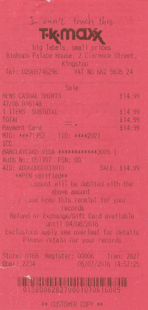 이모와 중고물품들이 가득한 샵에 들렀다. 나는 언젠가부터(아마 홍대에 자주 들락거릴 때인가 보다) 새것보다는 낡은 것이 좋았다. 부끄럽지만 그것이 유의미하게 저렴한 가격을 내보였기에 그 당시 지갑이 가벼웠던 나는 점점 새 상품에 거리감을 가질 수밖에 없었다. 이 날은 날깃거리는 남방 하나를 집었다. 15파운드(한화로 약 2만 5천 원) 정도의 옷을 사는데 한참을 고민하자 이모는 조카가 궁상떠는 건 못 본다며 냅다 집어 계산대로 가져갔다. 그렇게 반강제로 나는 그 옷을 손에 넣었다. 그리고 9년째 내 옷장 한편에 자리를 차지하는 중이다. 그날의 영수증은 붉었다. 영수증이 붉다니. 직원에게 영수증을 건네받고 나는 한참을 멍하니 바라만 보았다. 늘 하얀 바탕에 글씨를 기대하던 내게 느닷없는 강렬한 붉은색이 들이닥쳤다. 결국 아무것도 그릴 수가 없어서, 손을 델 엄두가 나지 않아 그대로 두었다. 아무도 밟지 않은 눈밭은 왠지 모르게 그대로 두고 싶다.