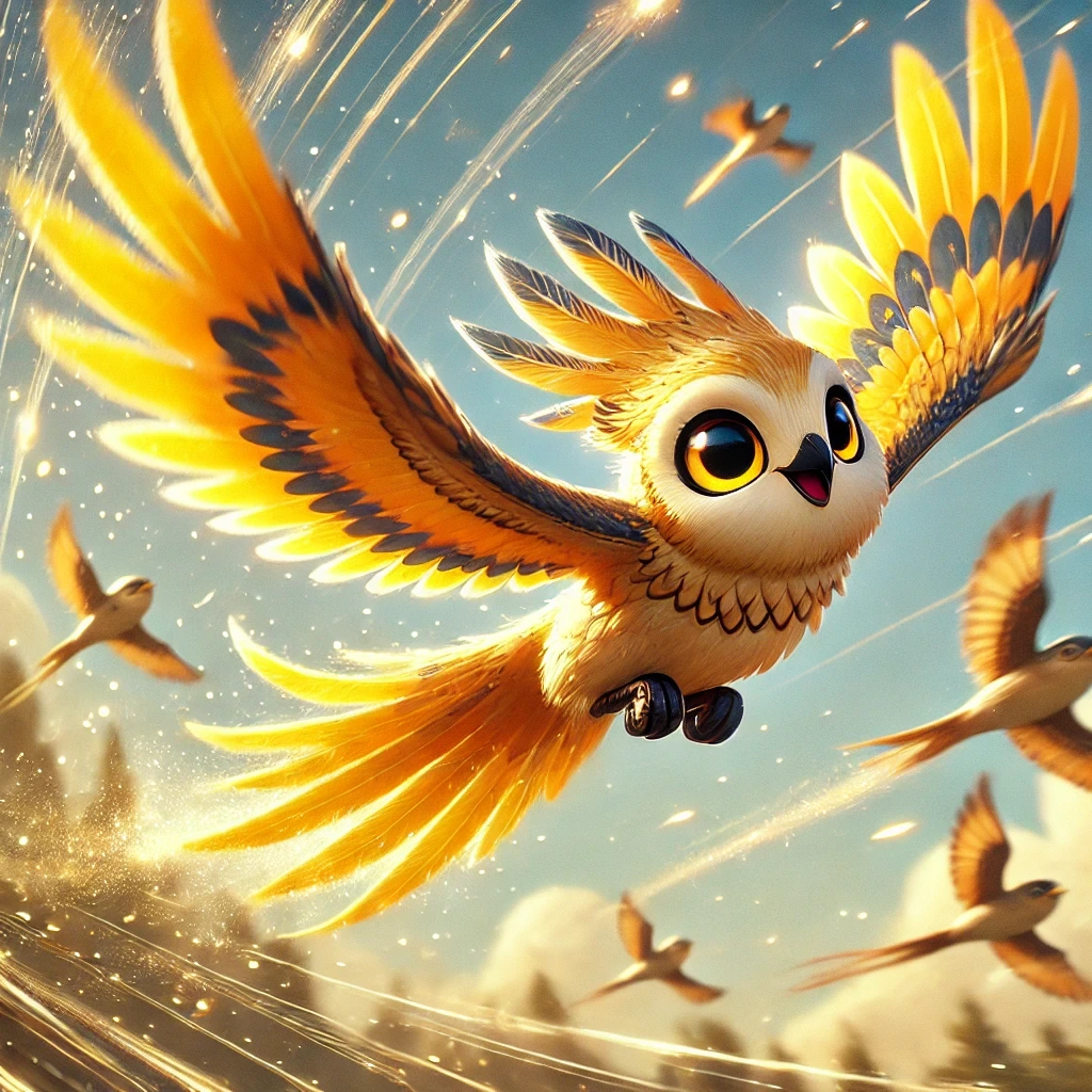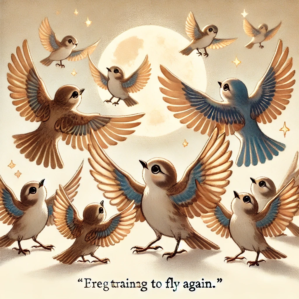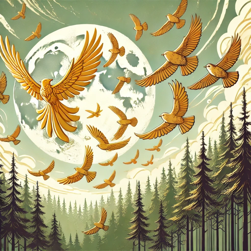 (모든 새들이 힘차게 하늘을 나는 모습, 숲이 평화롭게 어우러지는 장면.)