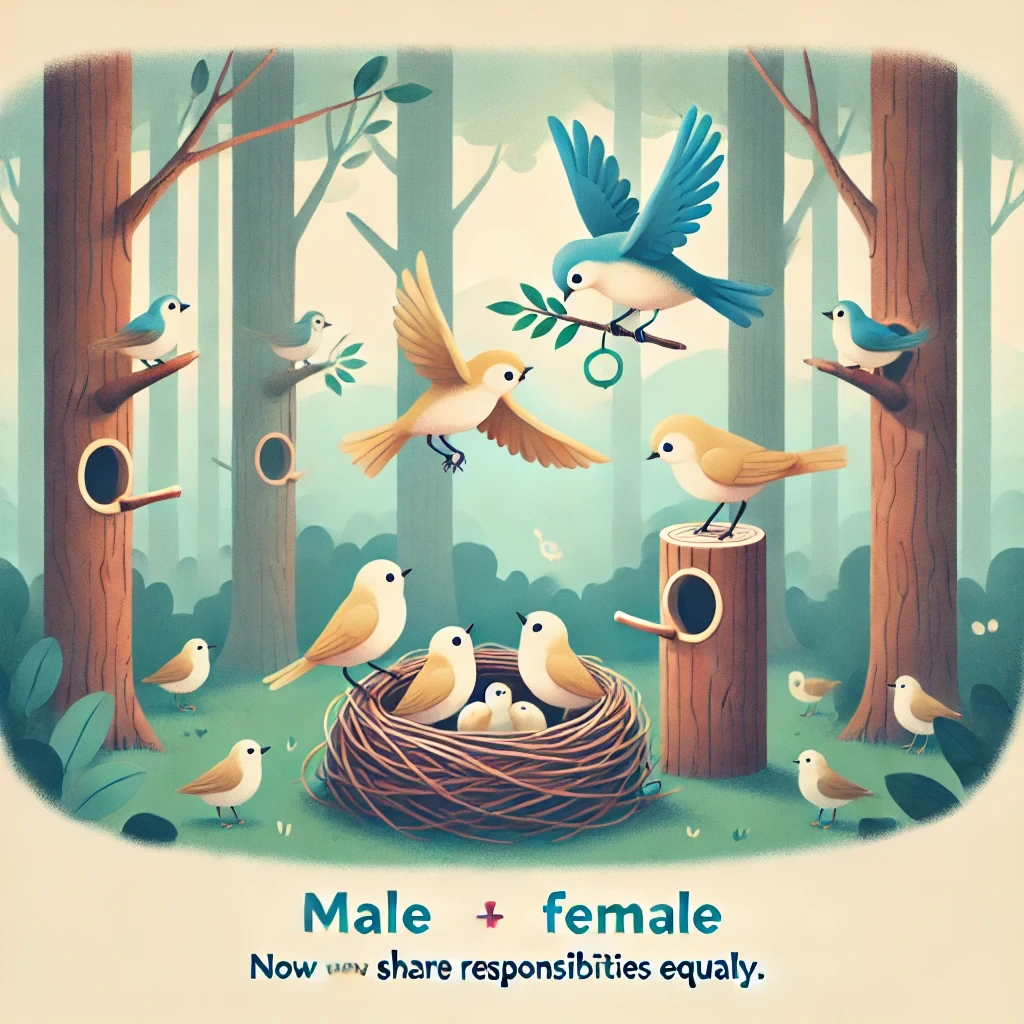 (암컷과 수컷 새들이 둥지를 함께 돌보는 모습, 새끼들이 행복하게 지내는 장면.)
