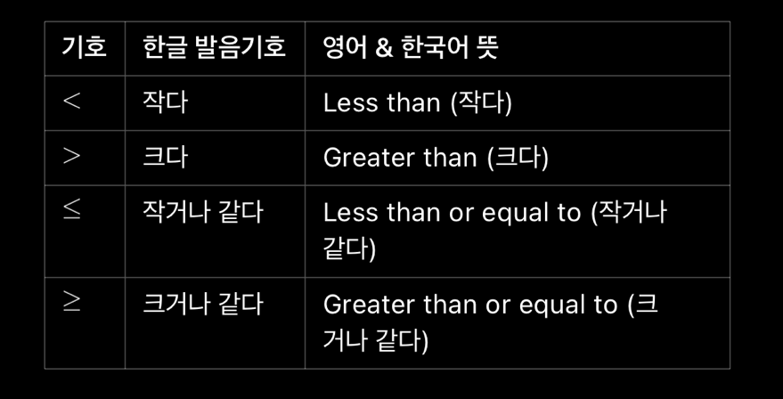 부등식(Inequality)이란 두 수 또는 식의 크기를 비교하는 식이야.