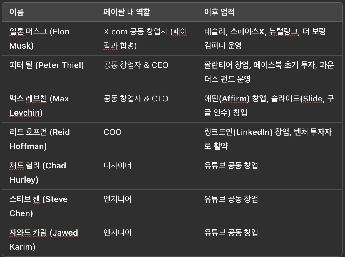 '페이팔 마피아'는 페이팔의 창업자와 초기 핵심 멤버들이 이후 실리콘밸리에서 큰 성공을 거두며 형성된 네트워크를 지칭하는 비공식 용어다. 이들은 페이팔이 2002년 eBay에 약 15억 달러에 인수된 후, 각각 새로운 회사를 창업하거나 벤처 투자자로 활동하며 기술 산업 전반에 막대한 영향을 미쳤다.