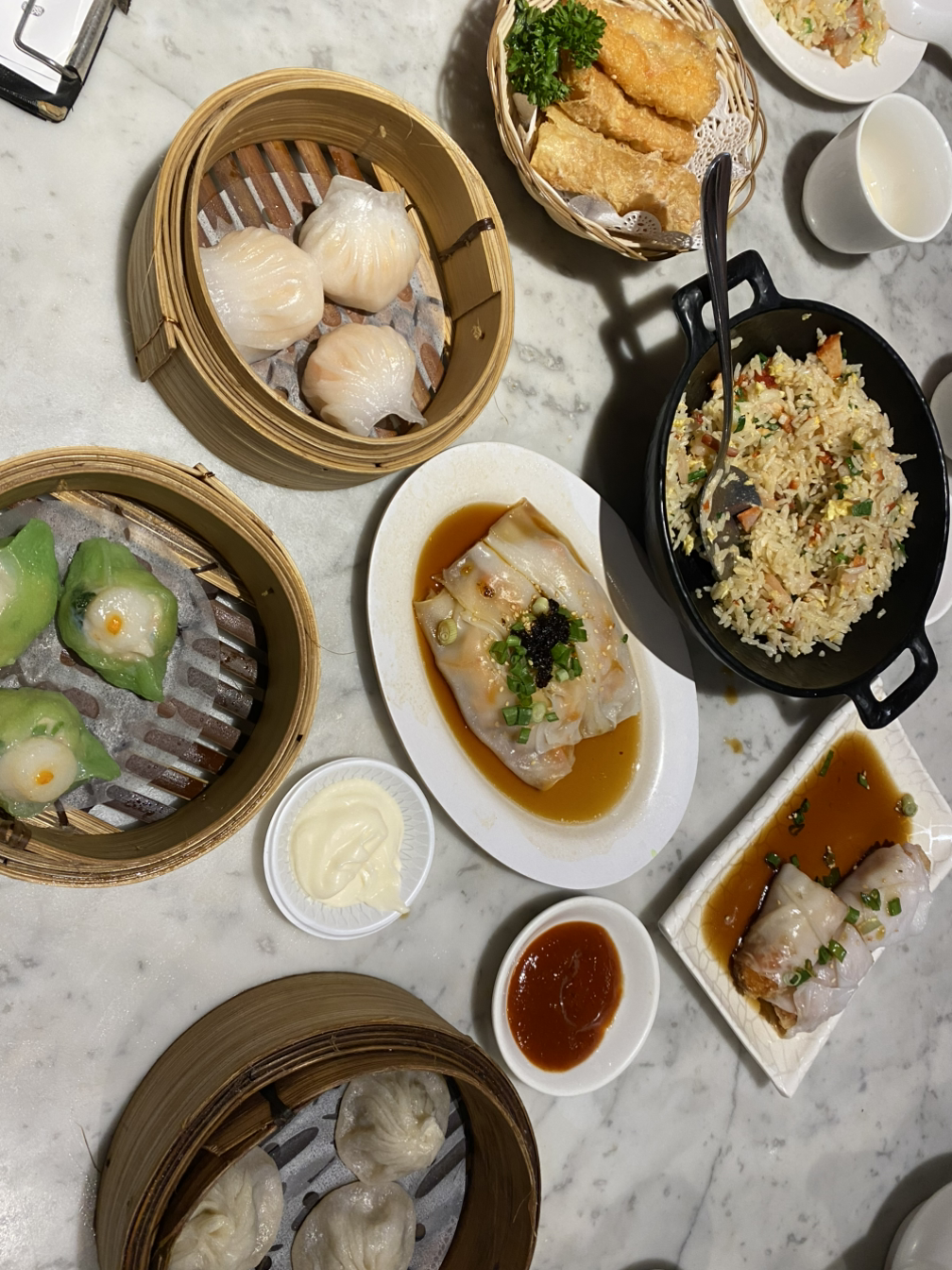 딤섬을 담은 대나무 찜기에서 피어오르는 김이