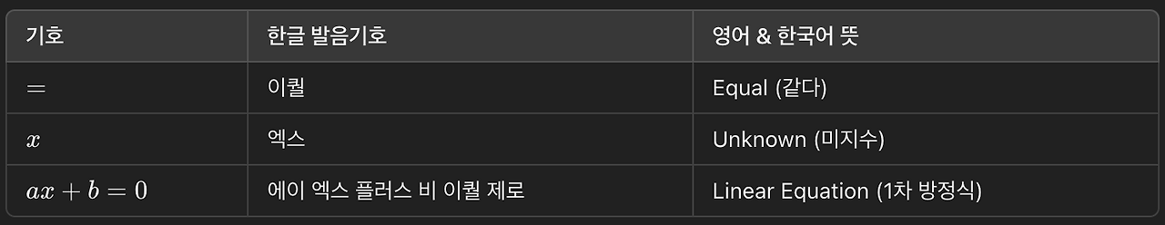 한 개의 미지수 x가 있고, 최고 차수가 1인 방정식. ax+b=0