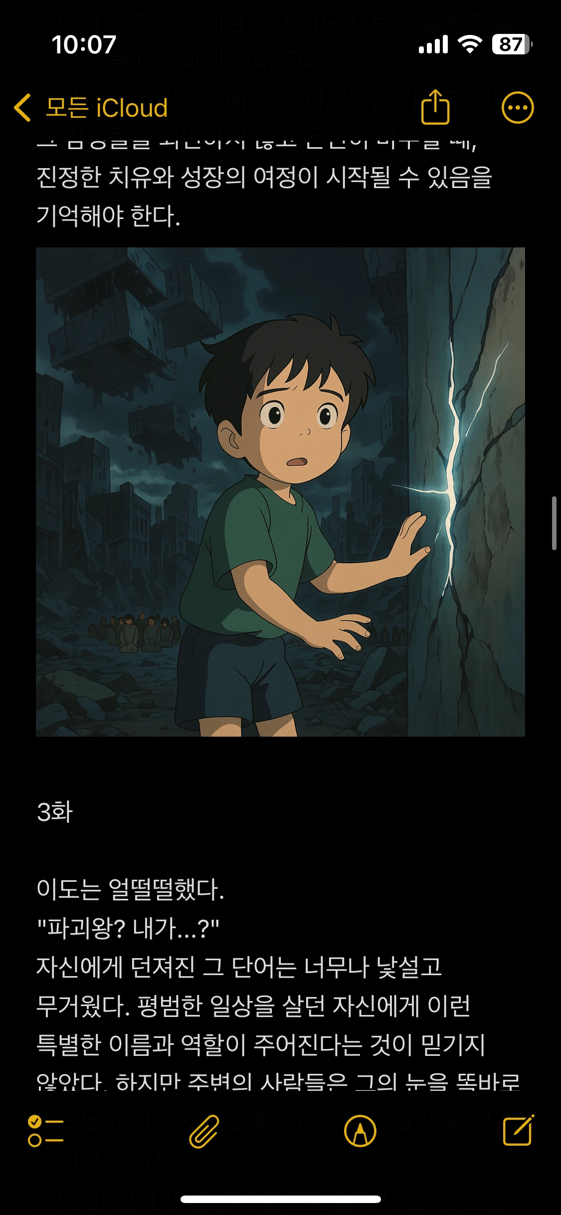 다시 눈을 떴을 때, 이도는 전혀 다른 세계에 서 있었다. 하늘은 먹구름으로 가득 덮여 어두웠고, 거대한 건물들은 무너져 내려 붕괴된 잔해들이 허공에서 천천히 떠다니고 있었다. 바닥에는 깨진 유리 조각들과 벽돌, 먼지로 뒤덮인 길이 끝없이 펼쳐져 있었다.