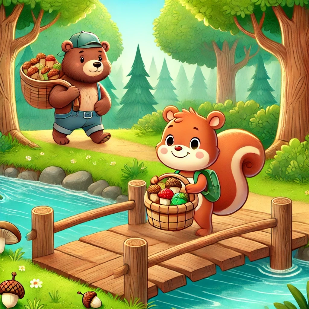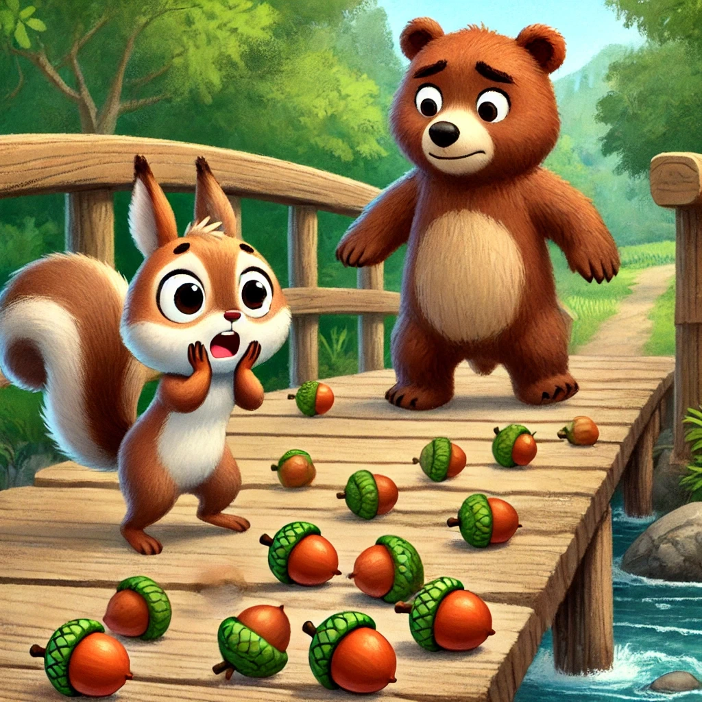 그런데 갑자기 다리를 지나던 곰 루카와 부딪혀 도토리를 모두 떨어뜨리고 말았어요.