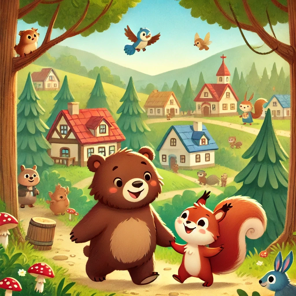 (평화로운 숲속 마을, 동물들이 각자 일을 하고 있는 모습.)