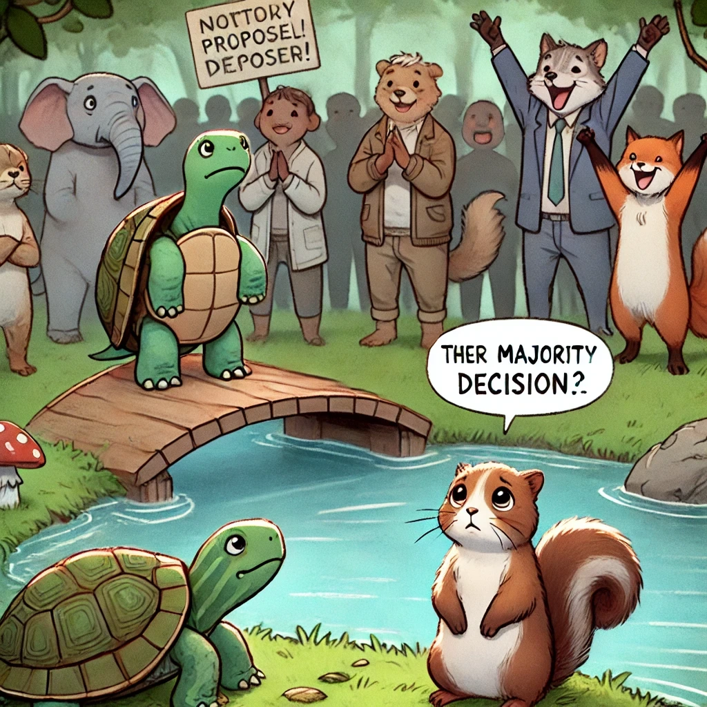 소수의 의견을 냈던 다람쥐와 거북이는 슬퍼했어요.