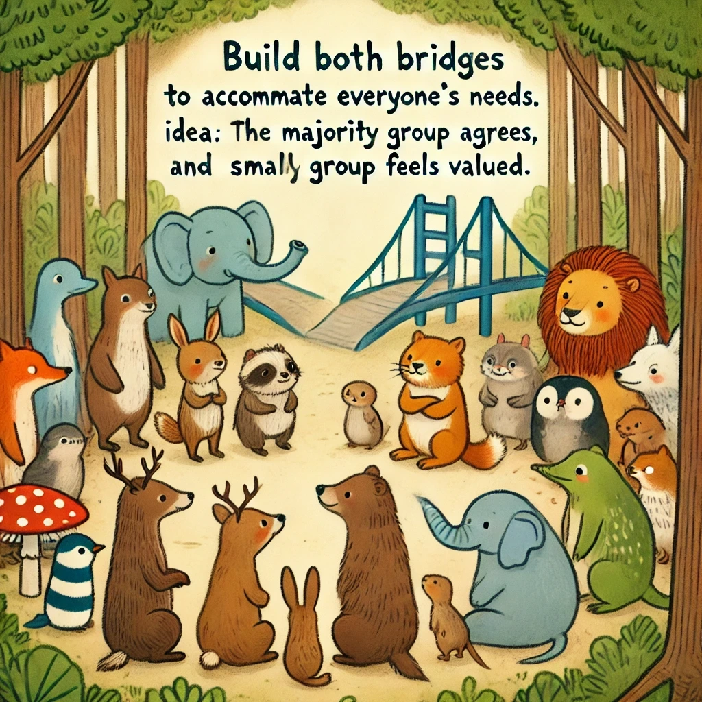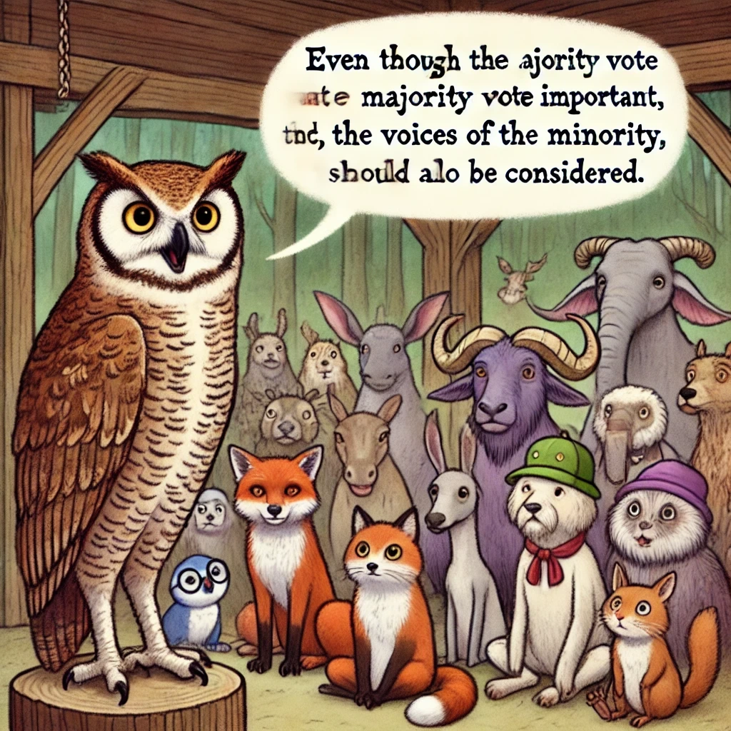 소수의 의견을 듣는 것이 더 좋은 해결책을 만들 수 있음을 동물들은 깨달았어요.
