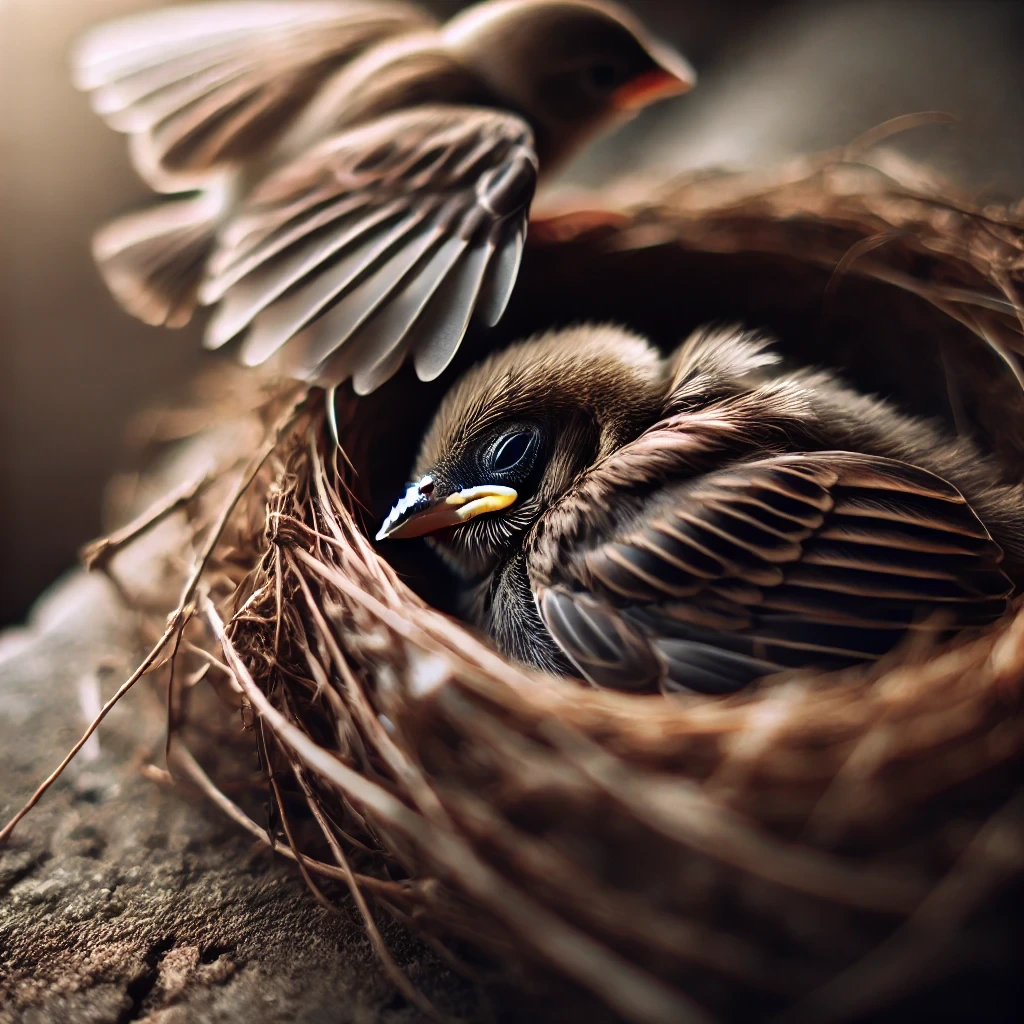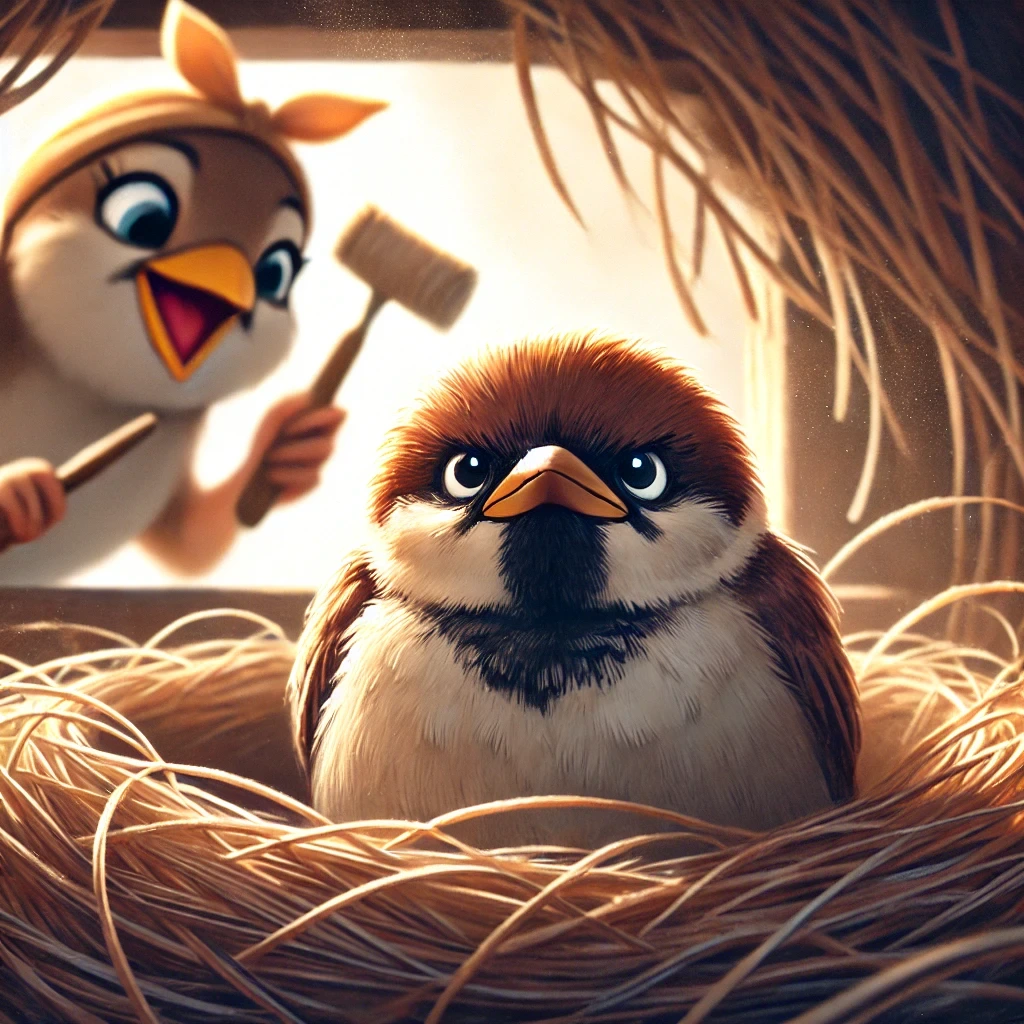 (참새가 둥지에 앉아 있지만, 멀리 다른 둥지를 바라보며 고민하는 장면.)