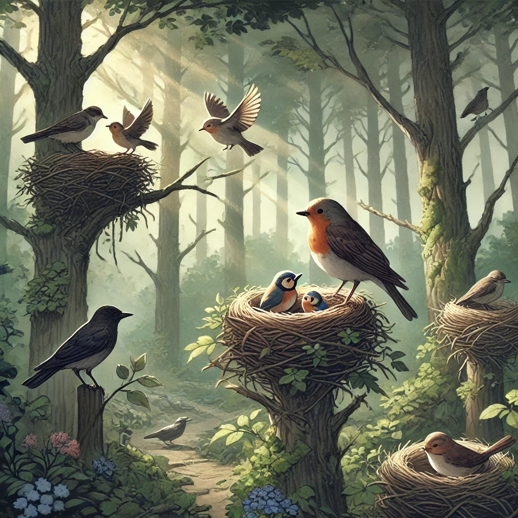 (평화로운 숲 속 마을, 나뭇가지 위에 새들이 둥지를 짓고 사랑스럽게 지내는 모습.)