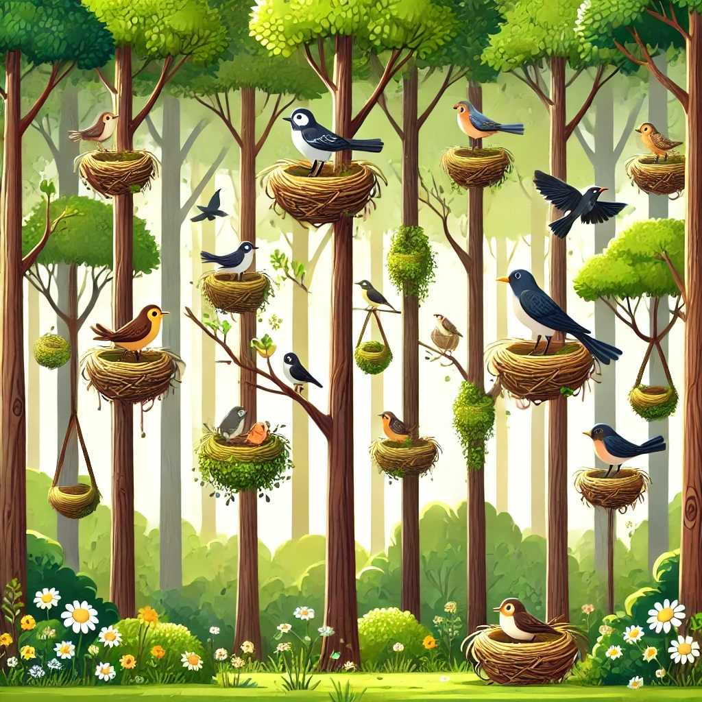 (숲 속 마을의 새들이 서로 둥지를 지키며 행복하게 지내는 모습.)