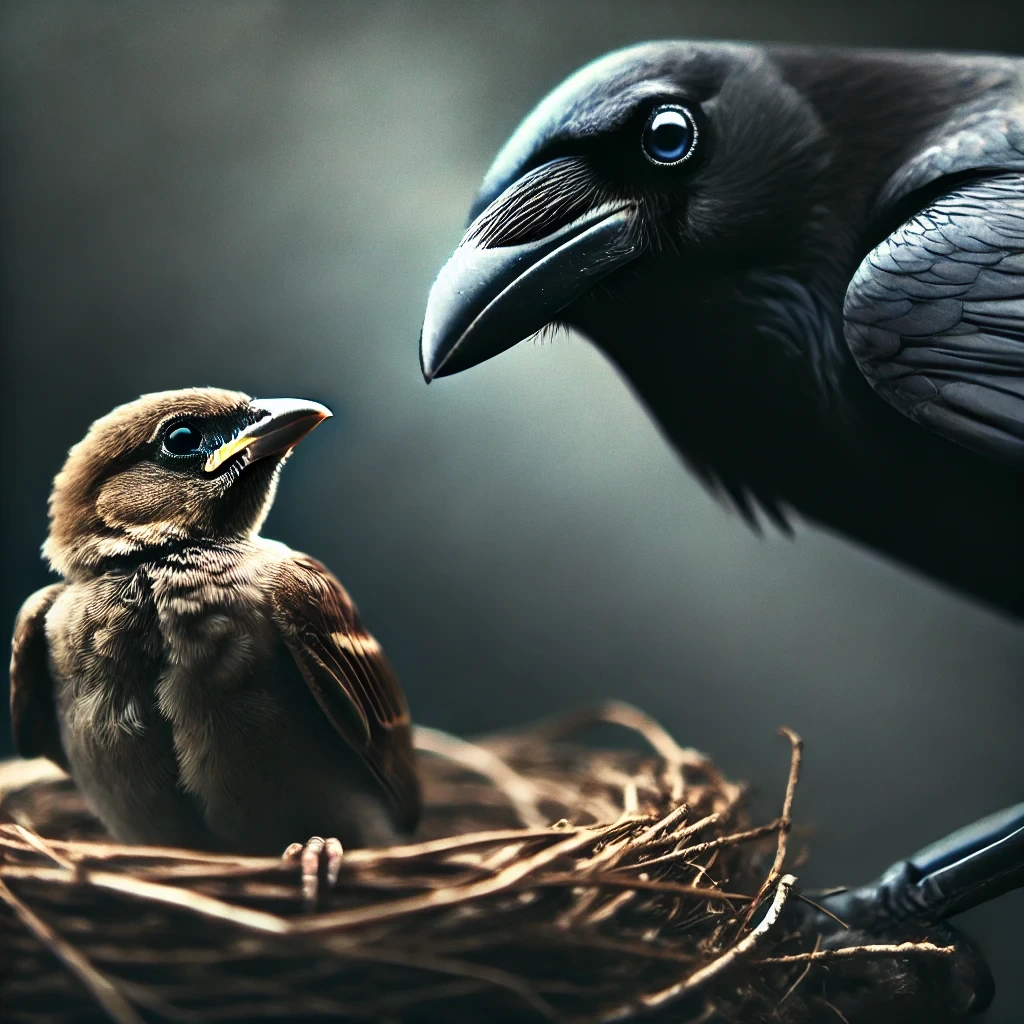 (참새가 까마귀 둥지로 날아가고, 남겨진 참새의 짝이 슬퍼하는 모습.)