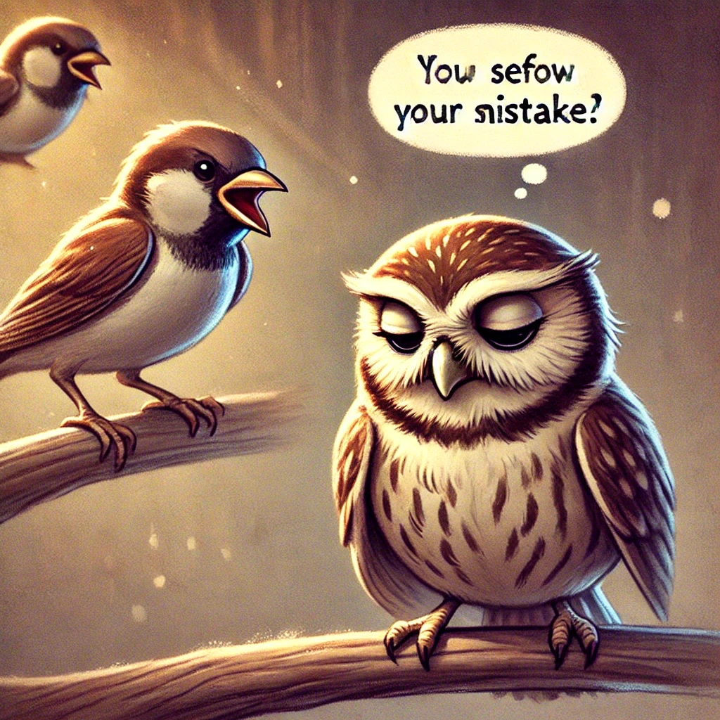 (까마귀가 참새를 바라보며 의심하는 모습, 참새는 당황한 표정을 짓고 있음.)