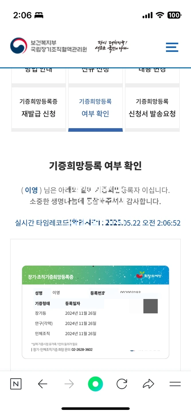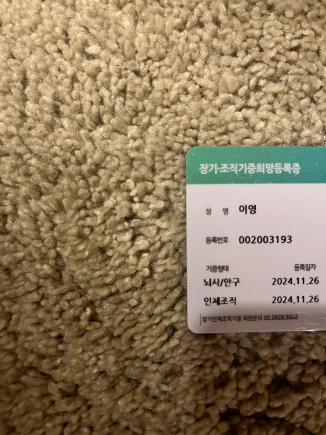 장기기증 등록증과 감사 편지가 함께 들어 있었다.