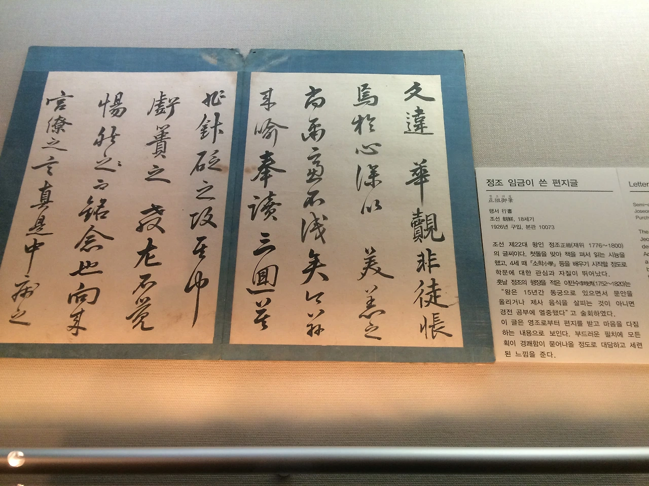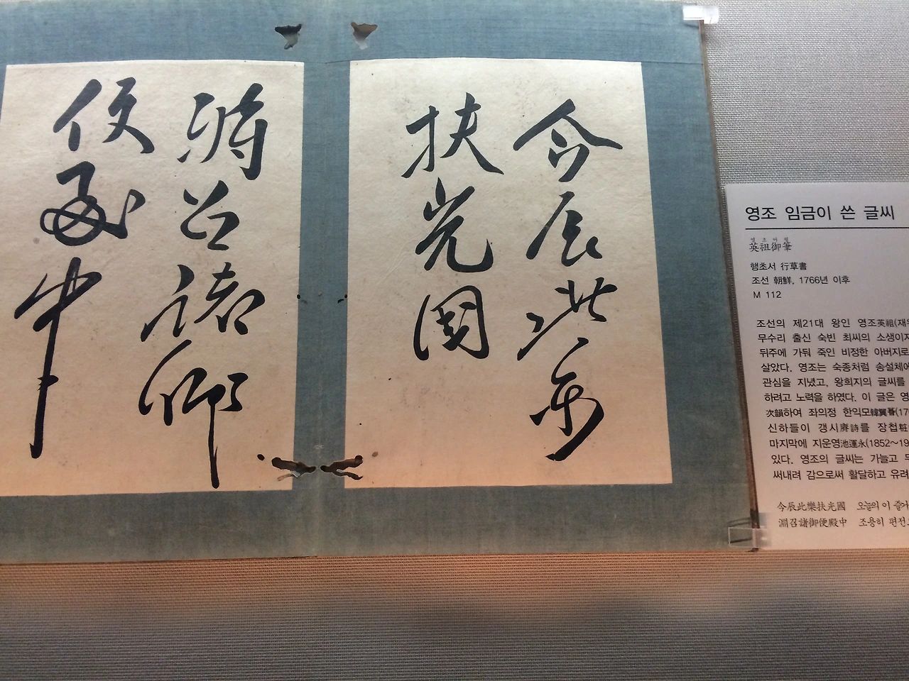 영조의 글씨를 보면 무언가 화려하면서도 유려한 느낌이 있다. 위 글씨 옆에 해설에도 그리 써놓은 것을 읽었다. 또한 부드러운 획을 보면 붓의 힘 조절도 자연스럽고 거침없는 손놀림에 빠른 속도로 써 내려갔을 느낌이 든다. 글씨에 정성이 들어갔다기보다 멋을 살린 느낌이 더 강하게 느껴진달까. 물론 매우 '즉흥적인 멋'이다. 인위로 연출한 느낌은 들지 않는다. 영조의 성품도 그러했을까를 상상해보곤 하는데 노론 강경파들에게 둘러싸여(혹은 그들에게 빚이 있는 임금으로서) 가져야 할 처세의 실력마저 감돈다. 조선의 군왕은 다른 역사/나라의 왕들과는 다르게 권력에 대한 견제와 균형이 제도적으로 잘 갖추어진 편이어서 왕 노릇이 쉽지 않았으므로.(왕이 마음대로 할 수 있는 건 한 가지도 없었던 나라가 조선이었으므로.) 신하들에게 밀리지 않을 실력 있고 권위 있는 왕으로서의 모습이 중요했을 조선 후기의 상황을 생각해보면 성군(聖君)으로 칭송받을만한 영조의 필체는 여러 면에서 사뭇 어울린달까. 물론 이 표현은 전적으로 주관적인 나의 생각일 뿐이다. 영조에 대한 생각도 전적으로 어떤 역사가의 연구결과나 역사적 사실(fact)이라기보다 어쩌면 나의 관점에서 짐작한 것일 뿐이다.