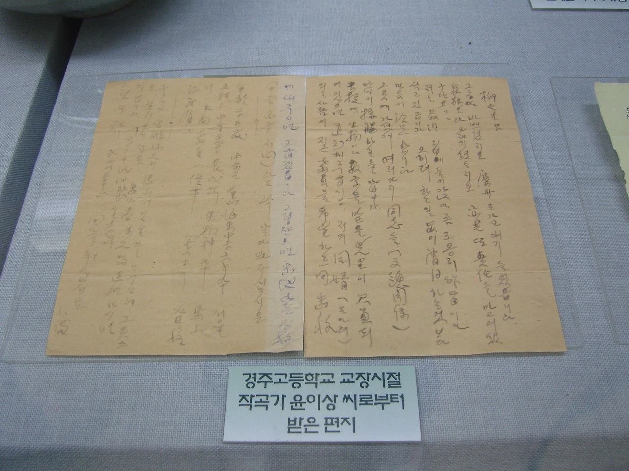 청마 문학관에서 유치환에게 윤이상이 보낸 편지를 한참이나 들여다보았다. 윤이상과 유치환이 친분관계를 유지했다는 점에서 먼저 놀라게 되었고, 유치환의 글씨와 책 내용보다도 어쩌면 그때의 나는 윤이상의 글씨에 더 마음이 이끌렸던 것 같다. "음악가의 글씨체는 역시 다르다!" 라며 상투적으로 내뱉었지만, 자세히 보면서 작곡가 윤이상에게 주목해본다. 세로 쓰기로 쓰인 필체에는 줄이 비뚤어지지 않고 쓰인 모양을 보며 성품에 제법 강단이 있었을 느낌이 들었다. 자신의 이상과 높이를 알고 있었을 성품일지도 모르겠다. 재미있는 글씨라는 느낌도 들었고, 자유를 갈망하나 굶주려있다는 느낌도 받았다. 수려하거나 멋진 글씨라기보다 자신의 의지를 보여주는, 숨김없고 솔직한 느낌의 글씨가 아닐까 생각했다. 성품도 그러했으리라 근거 없는 짐작을 해본다.
