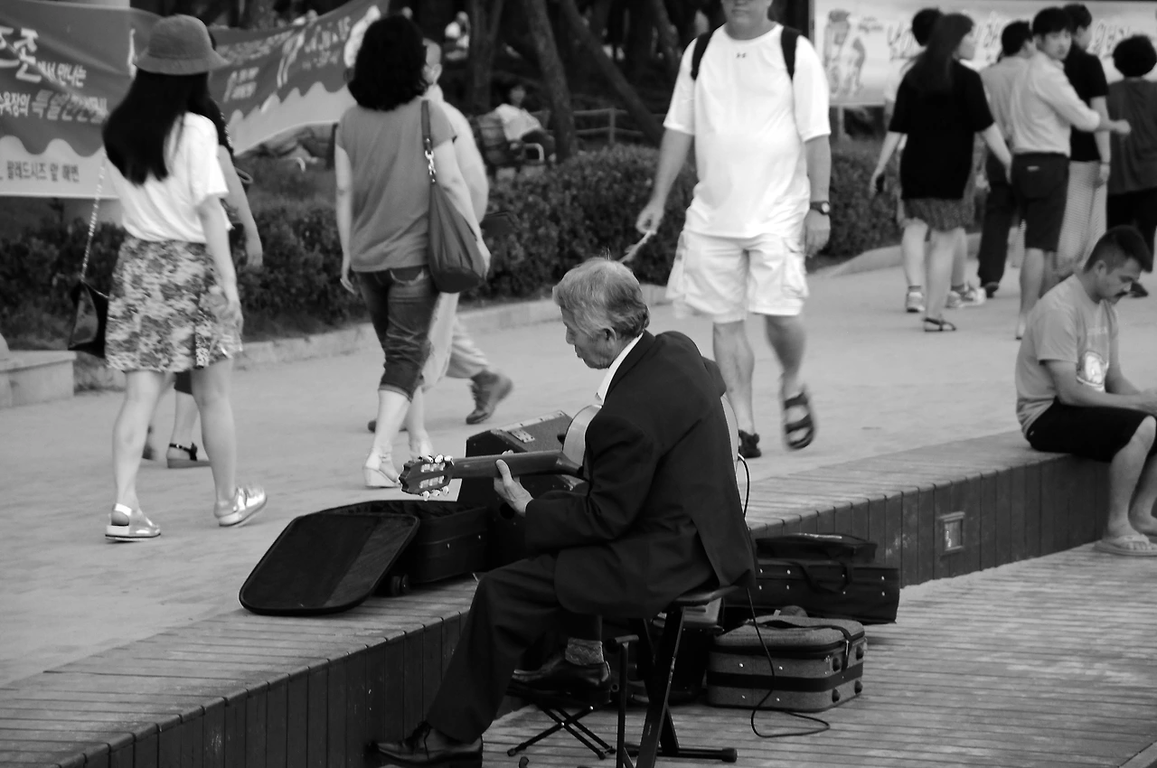 한여름의 날씨에 재킷까지 단정히 입고 그늘 한 뼘 없는 곳에서 클래식 기타로 연주하는 노신사.