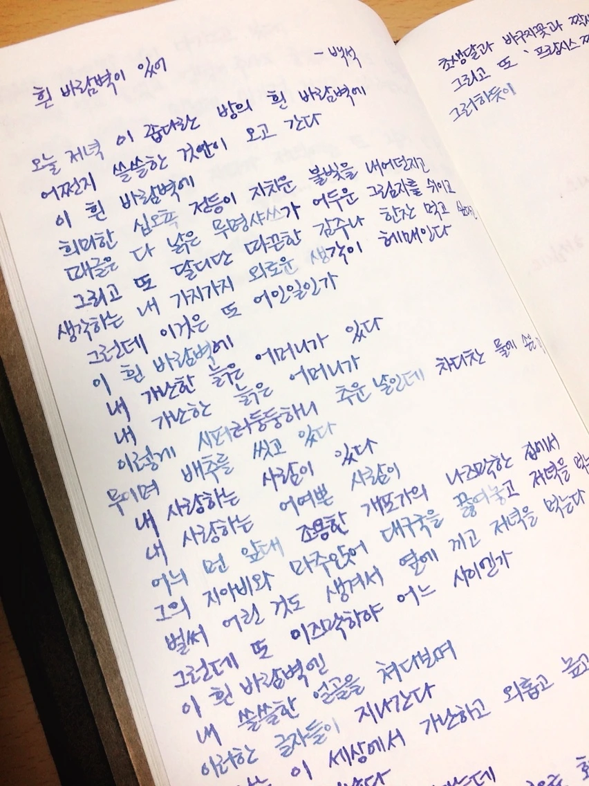고등학교 다닐 때부터다. 교과서에 있는 시와 모의고사 시험지 혹은 문제집에 등장하는 새로 보는 시, 그리고 나중에는 신문에 한 번씩 등장하는 시들을 모으기 시작했다. 신문에 있던 시는 가위로 오려서 수첩에 붙여두었고 시험지도 오렸으며, 오릴 수 없는 시는 직접 쓰기 시작했다. 노트에 한 글자 한 글자 베껴 쓰다 보면 의미에 대해 한번 더 곱씹게 된다. 좋은 글은 글씨로 옮겨보고 싶은 생각이 든다. 마치 시를 쓴 시인의 마음과 그 시마저 내가 훔치고 싶은 마음이 들 때가 있듯.