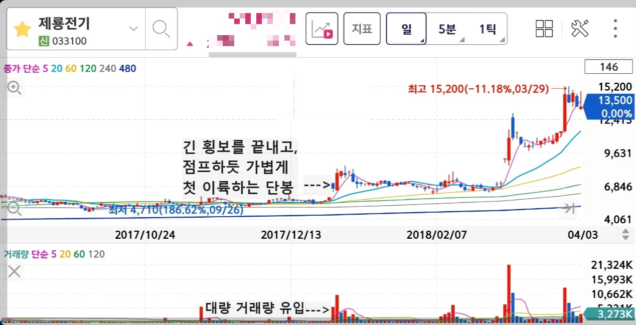 /몇 개월간의 지루한 박스권 횡보를 끝내고 2018년 1월 2일, 오사카 여행을 마치고 돌아오기 전 오사카 골목의 어느 카페에서 가족들과 시간을 보내고 있을 때, 1차 매집 폭발이 이뤄졌다.