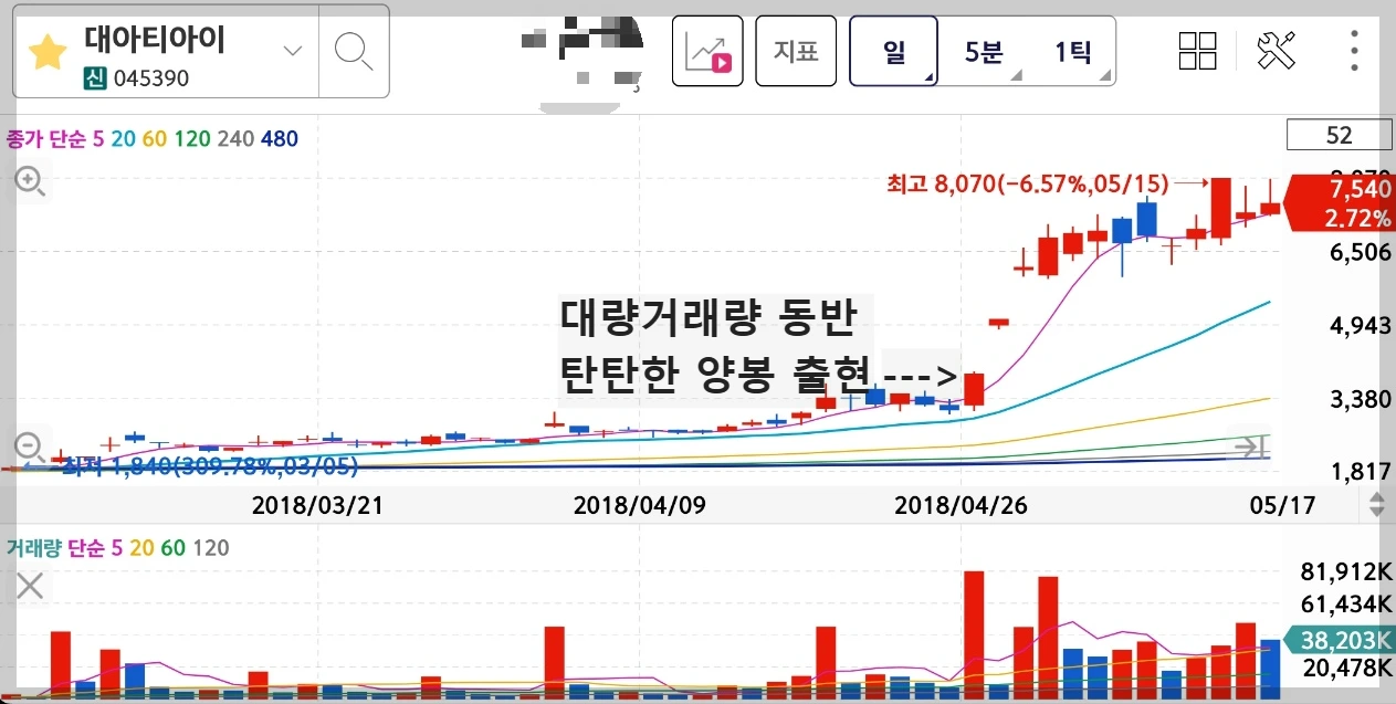 /남북경협주에 대한 기대감으로 다른 종목 발굴을 위해 공부를 하던 나는 [대아티아이]라는 철도주를 우연히 알게 되었고, 이 종목은 한 번에 매집하였다. [대아티아이]는 운이 좋게도 남북 정상회담이 있기 직전에 매수하여 단기간 큰 수익을 달성한 걸쭉한 종목이었다.